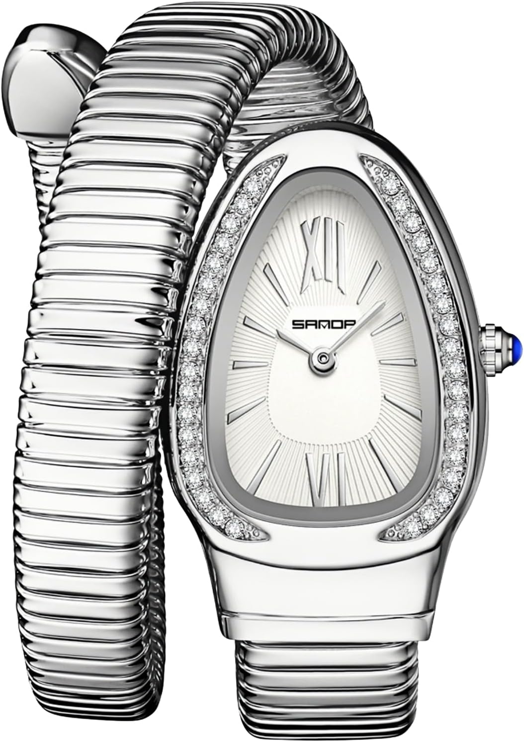 Gosasa Stylish Women's Snake Shape Bangle Watch Unique Design Snake Coil Elegant Dress Diamond Bracelet Ladies Quartz Wristwatch with Roman Numerals Dial