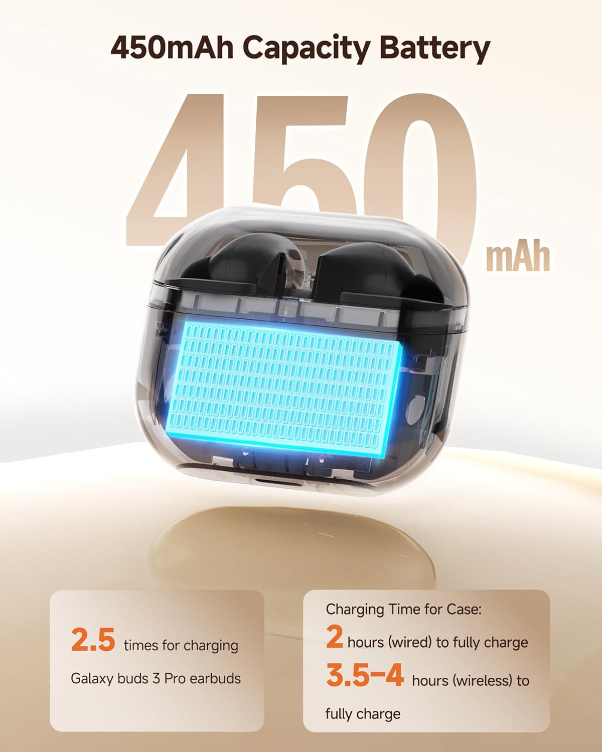 Built-in 450mAh Battery: The charging case for Galaxy Buds 3 Pro has a built-in 450mAh battery. When fully charged, it can recharge your earbuds up to 2.5 times, ensuring they stay powered throughout the day