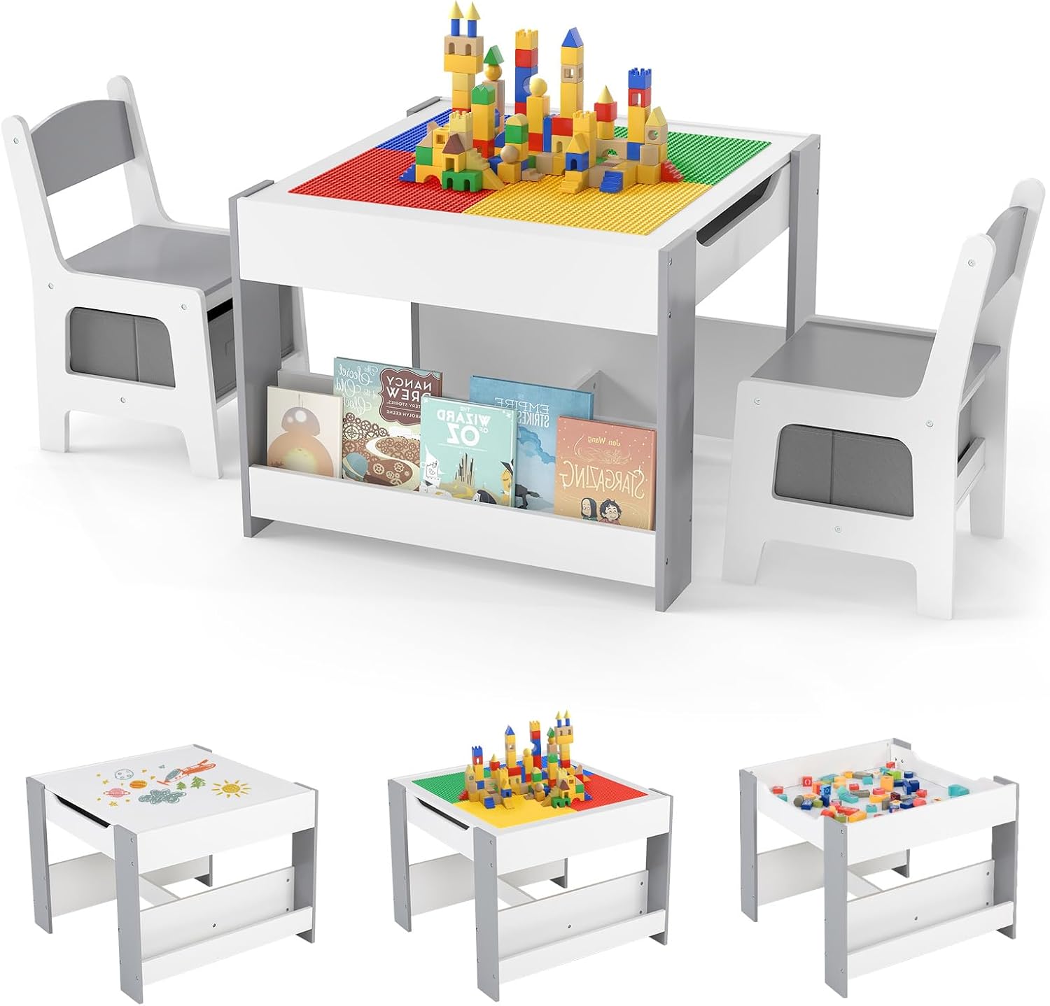 INFANS Kids Table and Chair Set, 4 in 1 Building Block Wooden Activity Desk with Reversible Tabletop Storage Drawers Bookshelves for Toddlers Art Craft Learning Reading Drawing Playroom (Grey)