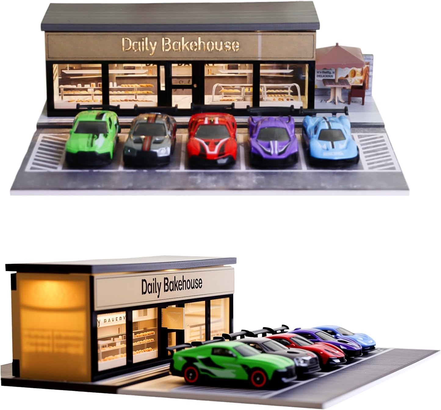 Immersive Bakery-Themed Display with LED Ambiance:Transform your model car collection into a captivating Bakery scene with this Diecast Model Cars Storage. The built-in LED lighting adds a cozy, warm glow that brings your prized toy cars to life, creating a perfect backdrop for your 1:64 scale models.