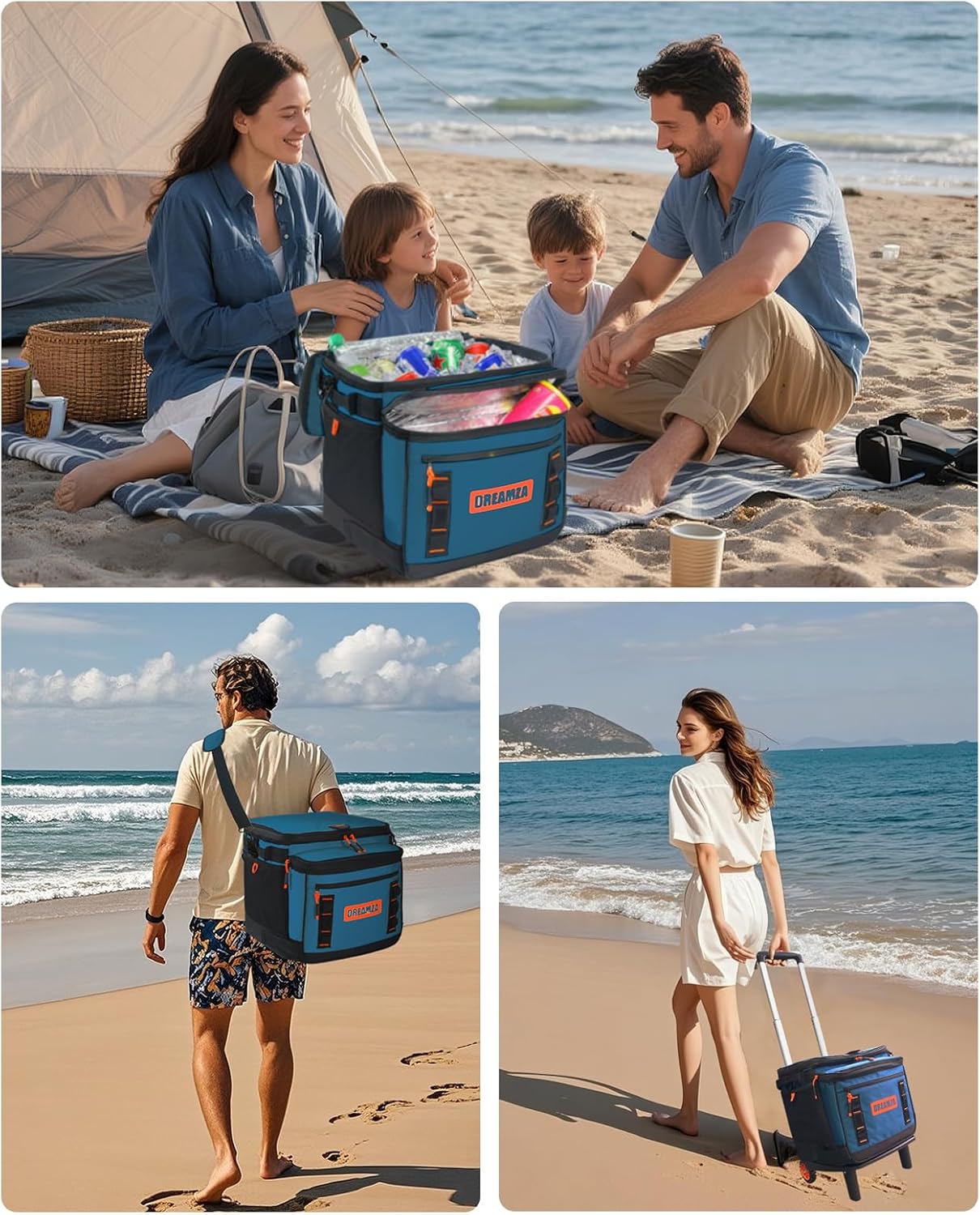 ▶ 60-Can Large Capacity with Smart Storage - Spacious enough for all your essentials: holds up to 50 cans in the main compartment, plus 10 more in the insulated front pocket. Also includes a handy front pouch, two mesh side pockets, and a detachable bottle opener. Multiple Carrying Options - wheel it, hand-carry, or shoulder-carry, designed for total convenience!