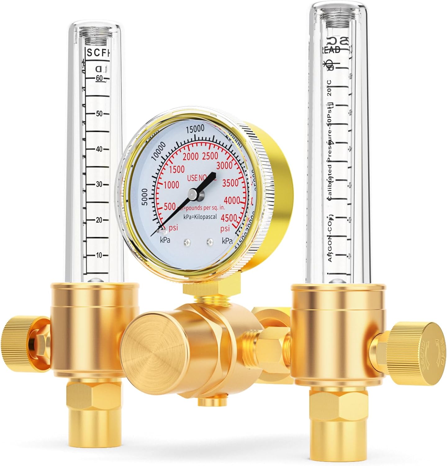 Dual Output Argon Regulator, Flow Meter 0-60CFH, CGA580 Inlet Connection, 5/8" x 18RH Outlet Fitting, for TIG MIG Welding
