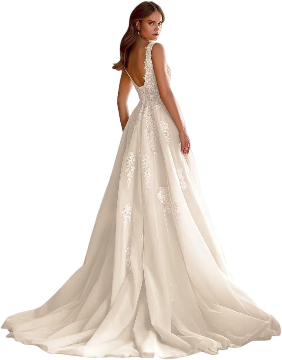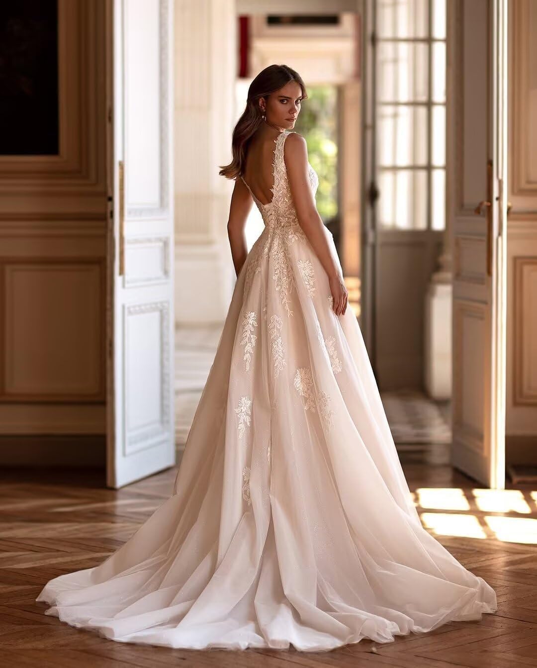 Sleeveless V Neck A Line Wedding Dresses for Bride 2025 Beach Boho Lace Applique Long Bride Gowns with Slit