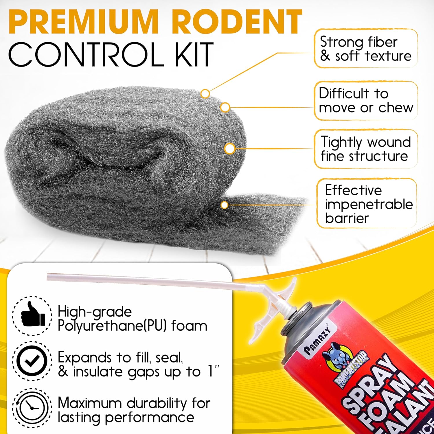 [Complete Rodent Barrier Kit—Keep Your Space Safe] This steel wool and foam sealant kit is perfect for blocking entry points around your home, including in garages, kitchens, attics, basements, windows, around pipes, and more. It also works for polishing surfaces and removing stains like paint and dirt, making it a versatile tool for both mice & rodent control and cleaning tasks throughout your home. PACKAGING: 1x Steel Wool (3.2"x7.5 FT), 1x Spray Foam (350ml), 1x Gloves, 1x Scissors
