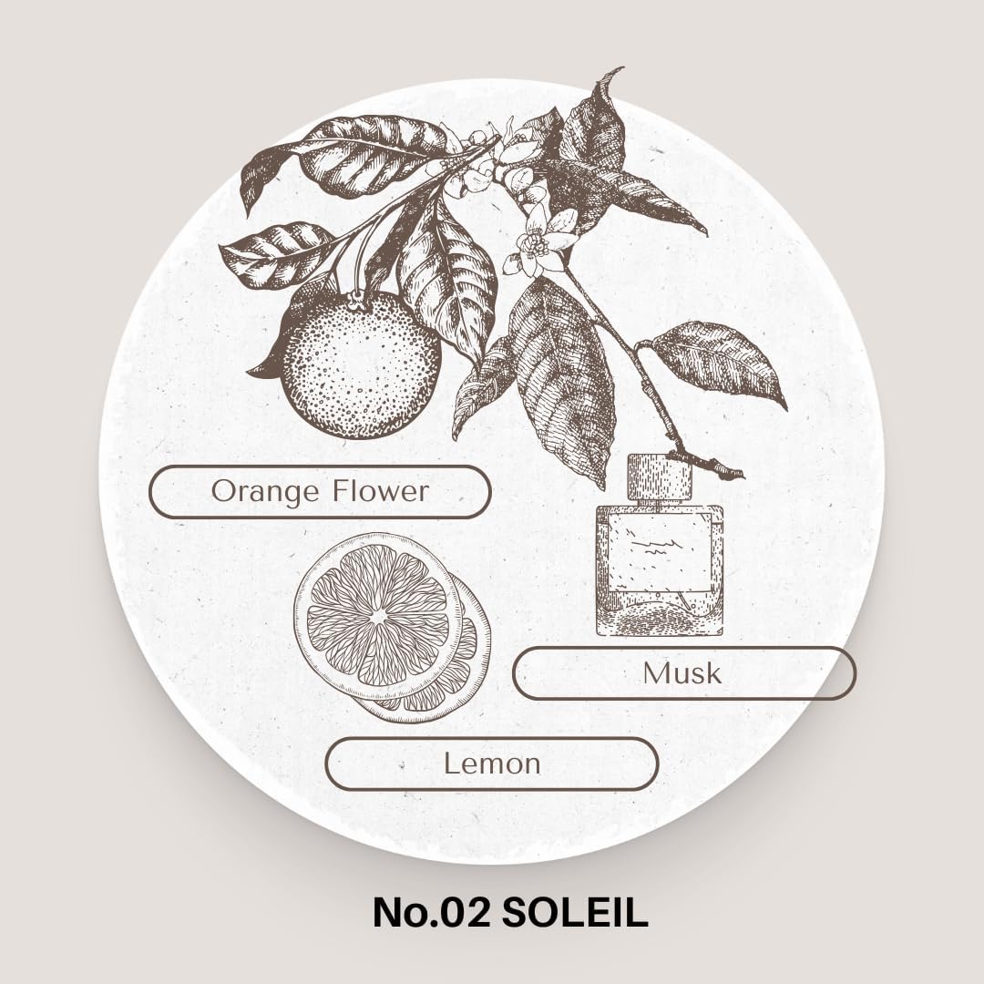 FRAGRANCE DESCRIPTION OF No.02 SOLEIL : No.02 SOLEIL lifts your spirits and illuminates your day with its bright, energizing, and gentle aura. The cheerful Orange Flower dances harmoniously with the exotic allure of Jasmine, creating a scent that's fresh and invigorating, yet delicately balanced. Enjoy the feeling of "Pure Joy" that SOLEIL invokes!