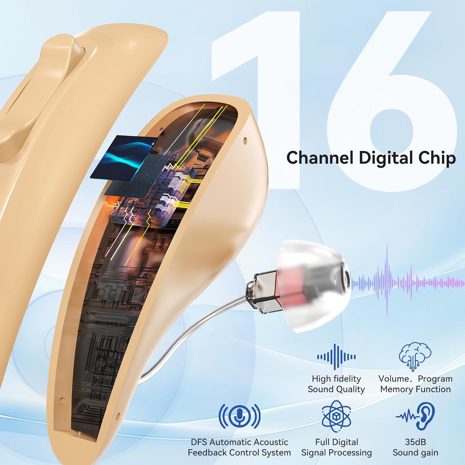 【DSP Noise Reduction Hearing Aid】Equipped with a high-performance DSP chip, this hearing amplifier filters background sounds and suppresses high-frequency feedback for optimized speech recognition and comfortable listening.
