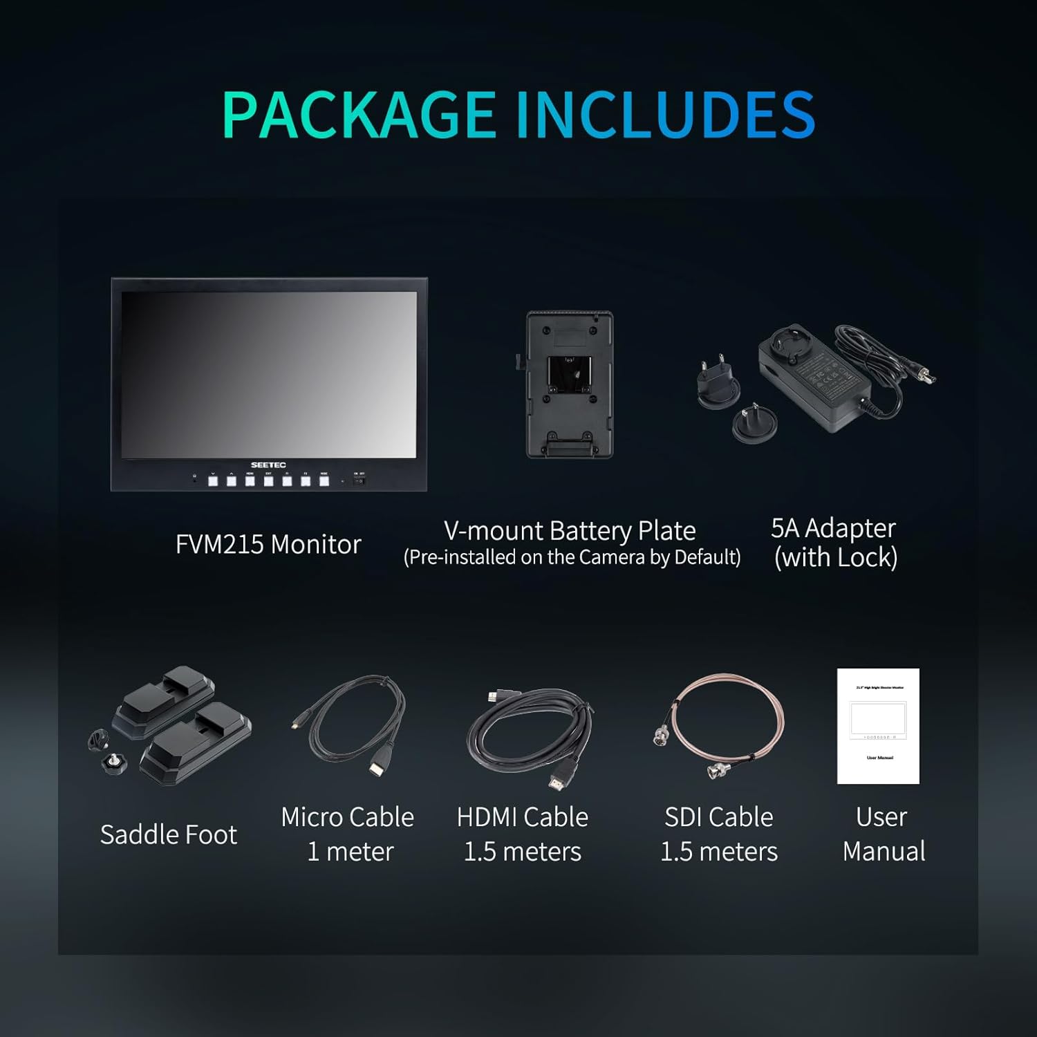 【Package Include】1× FVM215 FEELWORLD Monitor, 1× SDI Cable, 1× Micro HDMI Cable, 1× HDMI Cable, 1× 5A Power Adapter, 1× V-mount Battery Plate (default to mount on the monitor), 1× Manual