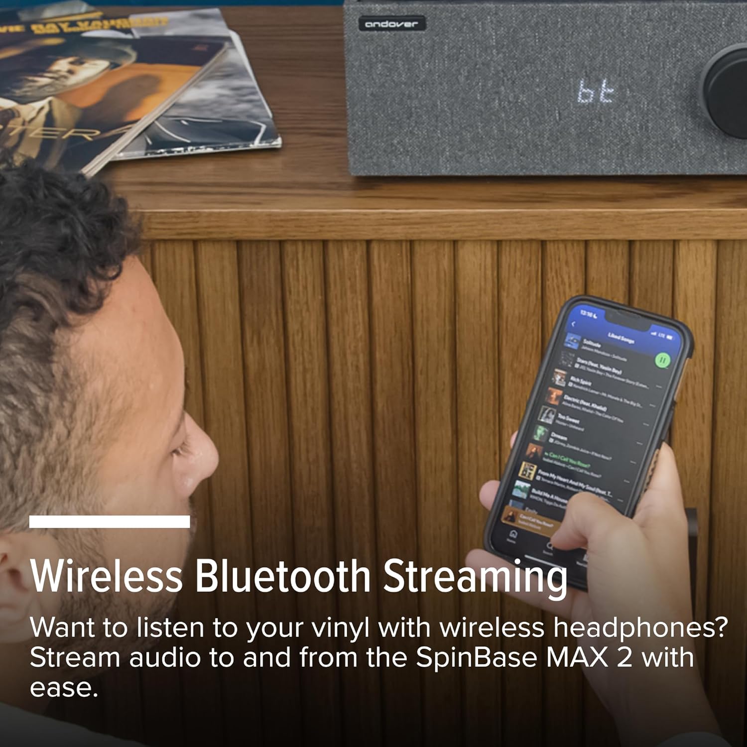 TWO-WAY BLUETOOTH STREAMING: Stream your favorite playlists directly from your smartphone, tablet, or computer with built-in Bluetooth. The SpinBase MAX 2 not only receives Bluetooth audio but can also transmit wirelessly to Bluetooth-enabled speakers or headphones, giving you complete flexibility in how you listen.