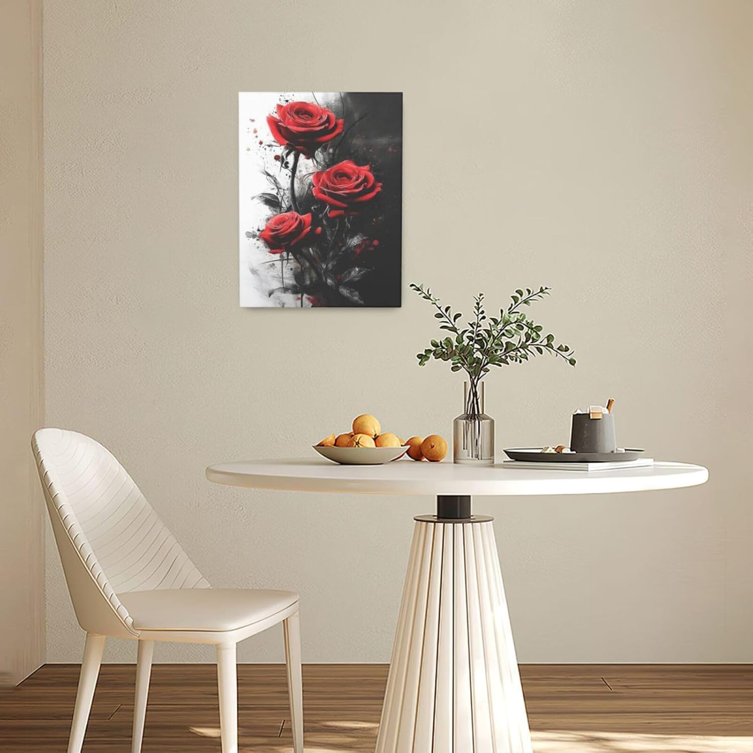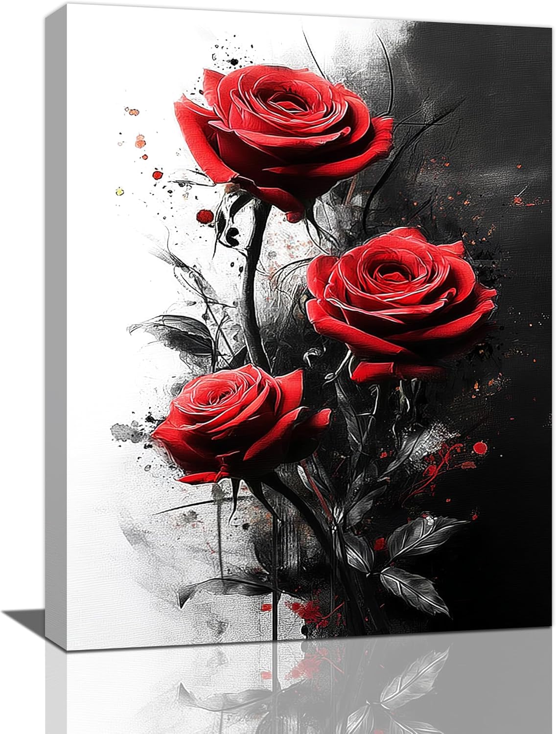Crekviy Red Rose Wall Art Black and White Flower Floral Pictures Wall Decor Canvas Prints Painting Artwork Romantic Decoration for Bathroom Bedroom Living Room Framed Gifts 12"x16"