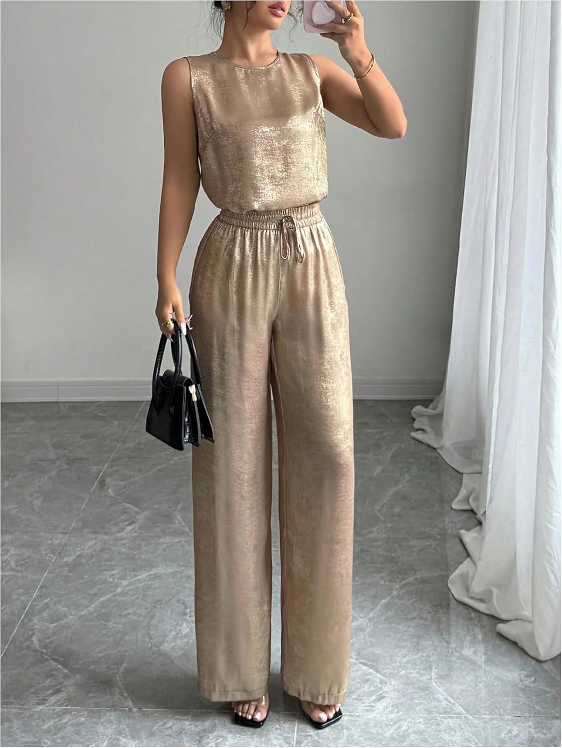 OYOANGLE Women's 2 Pieces Outfits Metallic Cami Top and Loose Wide Leg Pants Party Lounge Sets