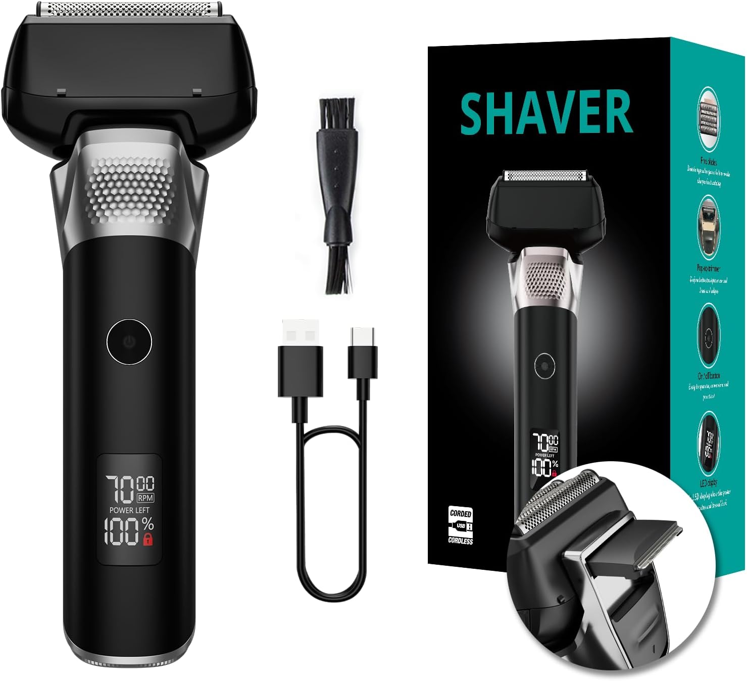 LED Display & Travel Lock : The men's electric shaver with LED display, you can know the remaining battery level and recharge in time; this men's electric shaver has a compact lightweight body and clever travel lock; simply press and hold the on/off button for 3 seconds to activate, ensuring your razor shuts off safely on the go. Ideal for traveling or business trips.