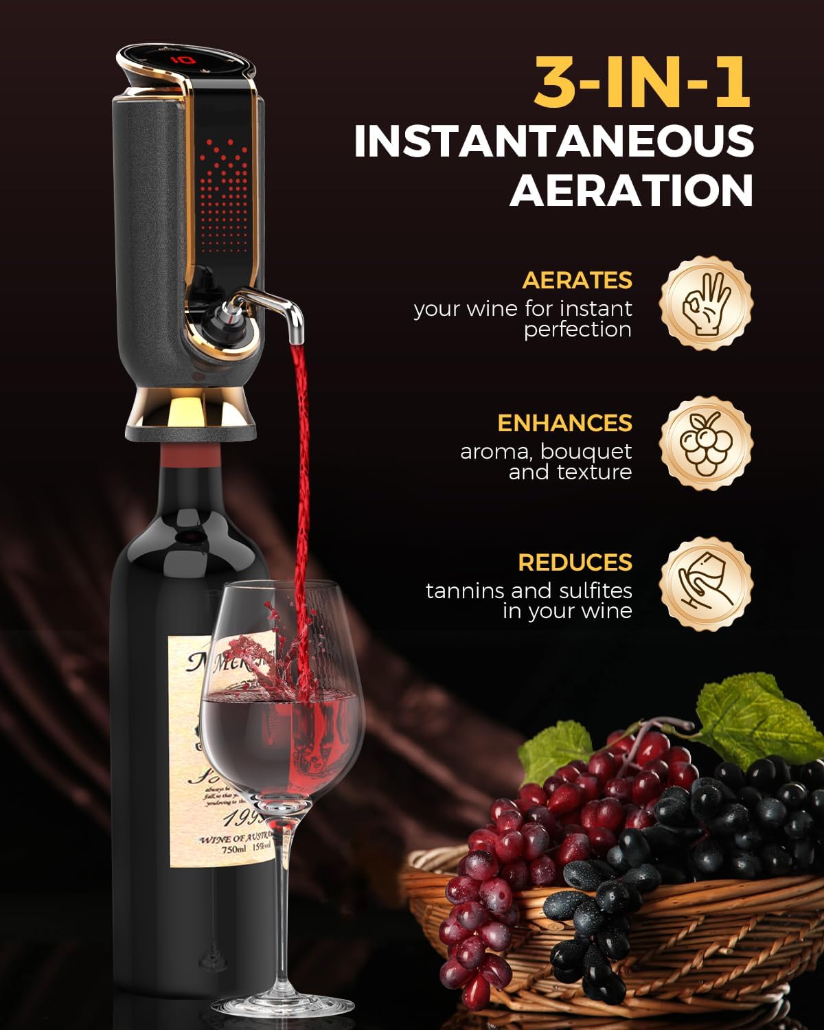 Luxurious 3-in-1 Electric Wine Aerator, Dispenser & Vacuum Pump - Wine Preservation System - Gifts for Women Wife Men Husband(Black/Gold)