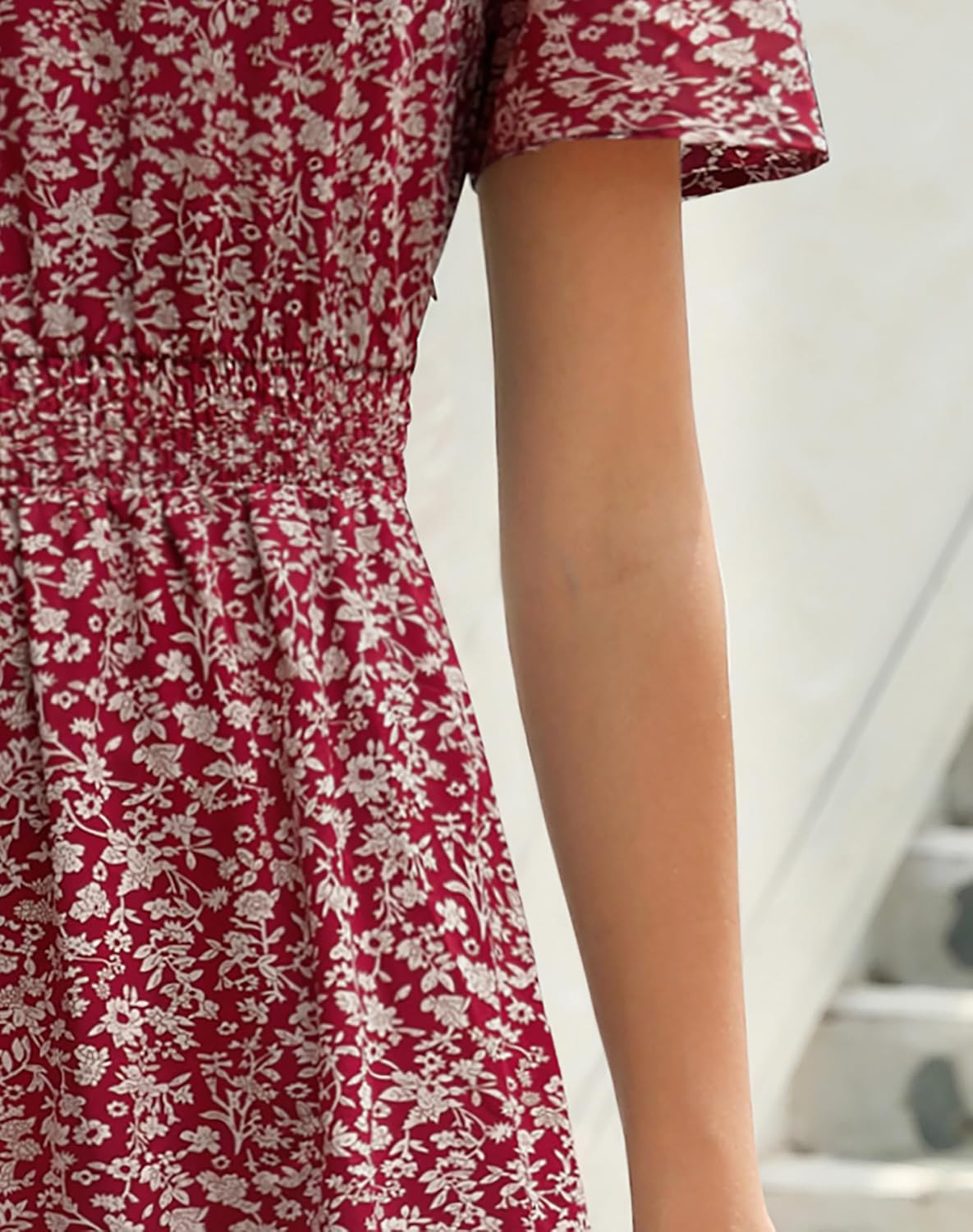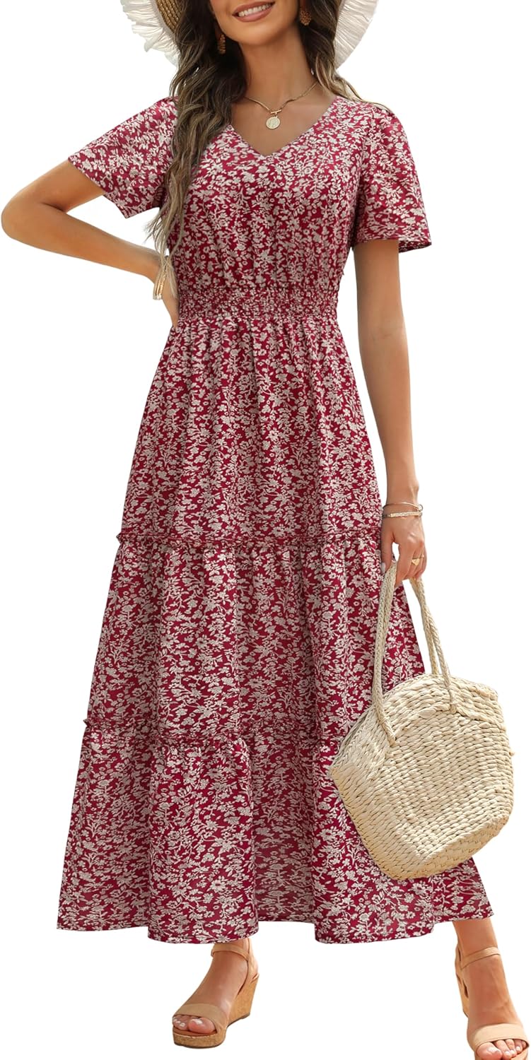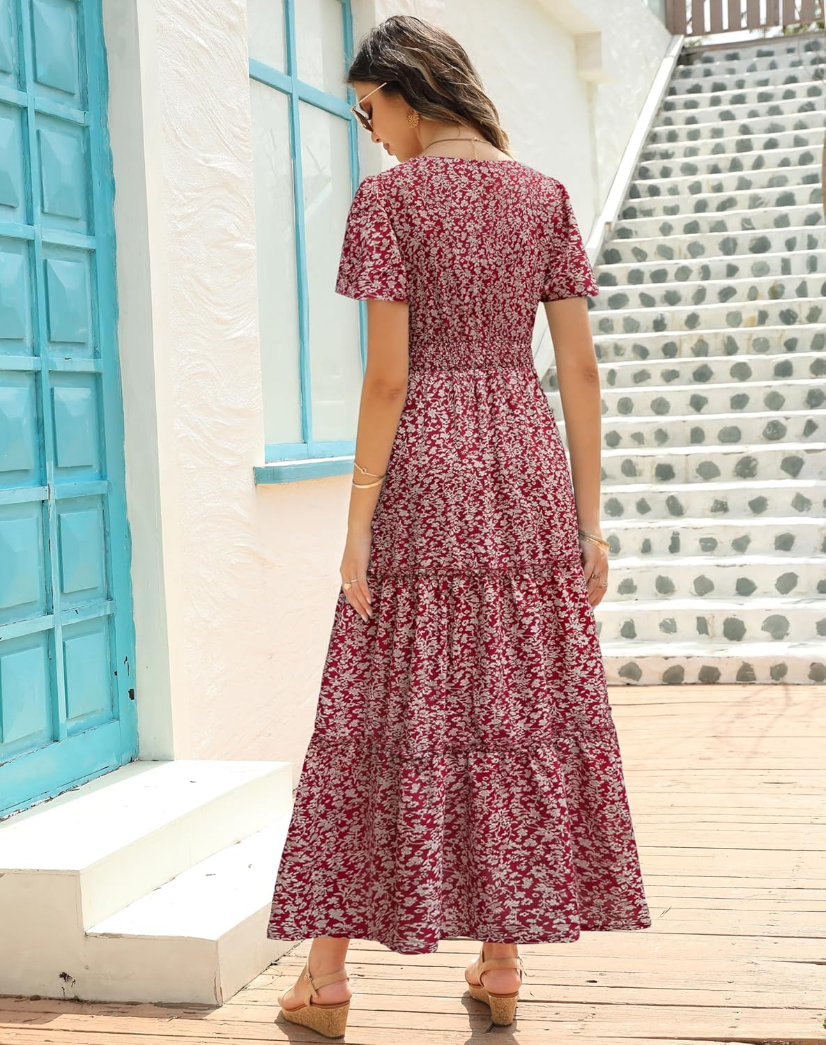 Zattcas Womens 2025 Long Summer Dress Short Flutter Sleeve V Neck Casual Smocked Tiered Modest Floral Boho Maxi Dress