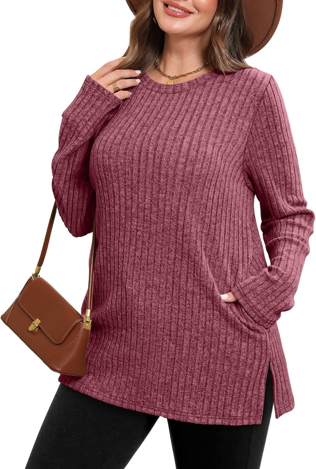 SAMPEEL Womens Sweaters Crewneck Long Sleeve Shirts with Pockets Fall Outfits 2025 Fashion Winter Clothing Side Slit