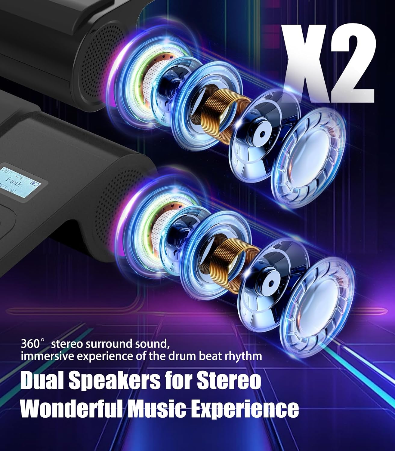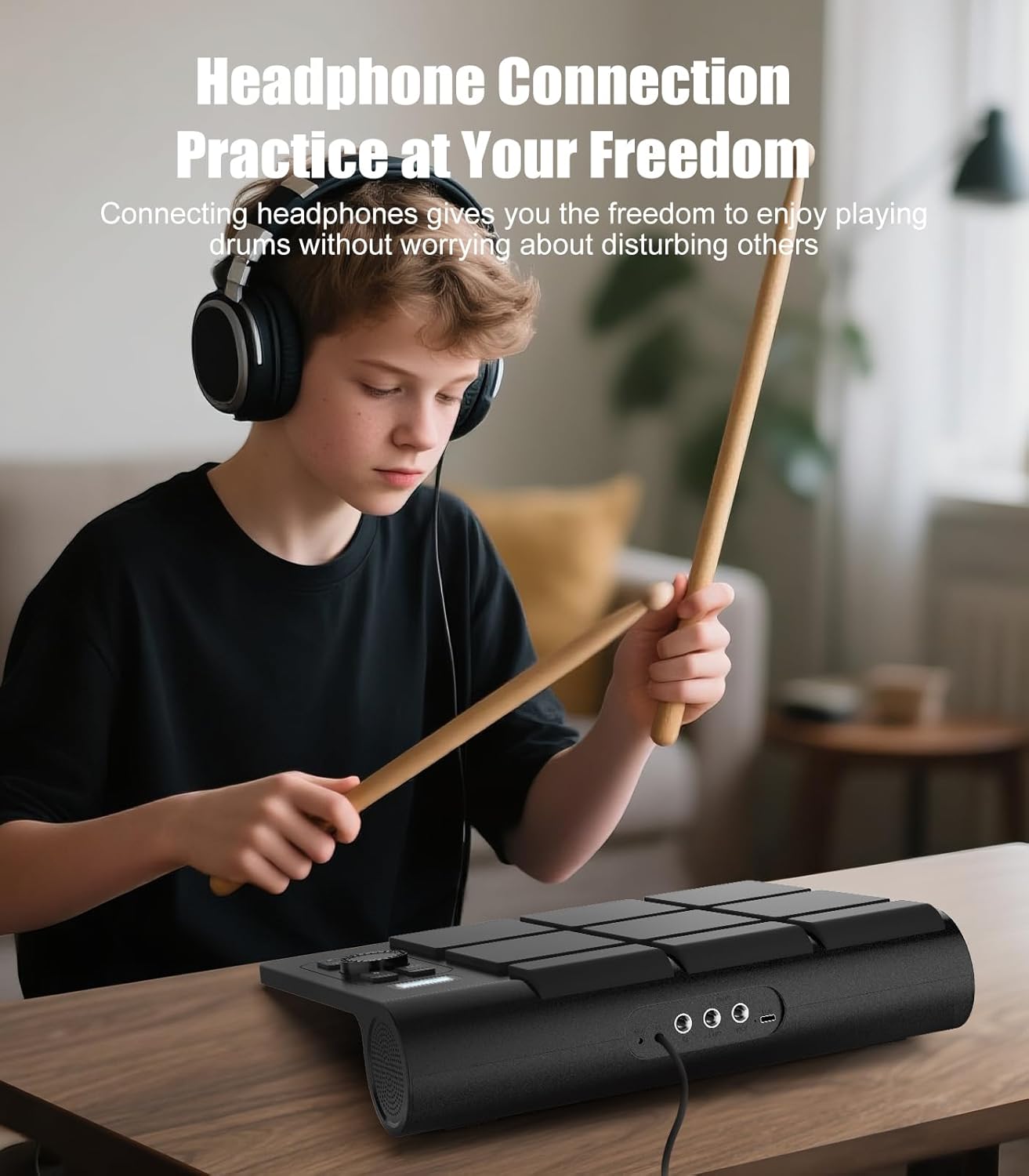 Ubiquitous Music Experience​:Powered by a built-in 2000mAh battery, the Sovvid portable e-drum can be taken anywhere you desire. Its dual-speaker stereo system offers a 360° immersive drumming experience. You can also connect headphones for quiet play, so you can keep drumming without disturbing others