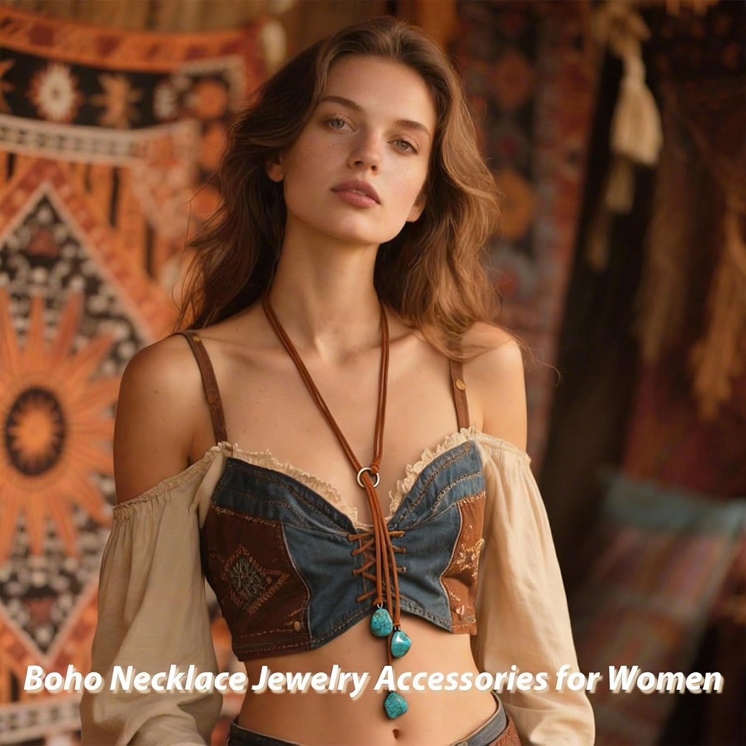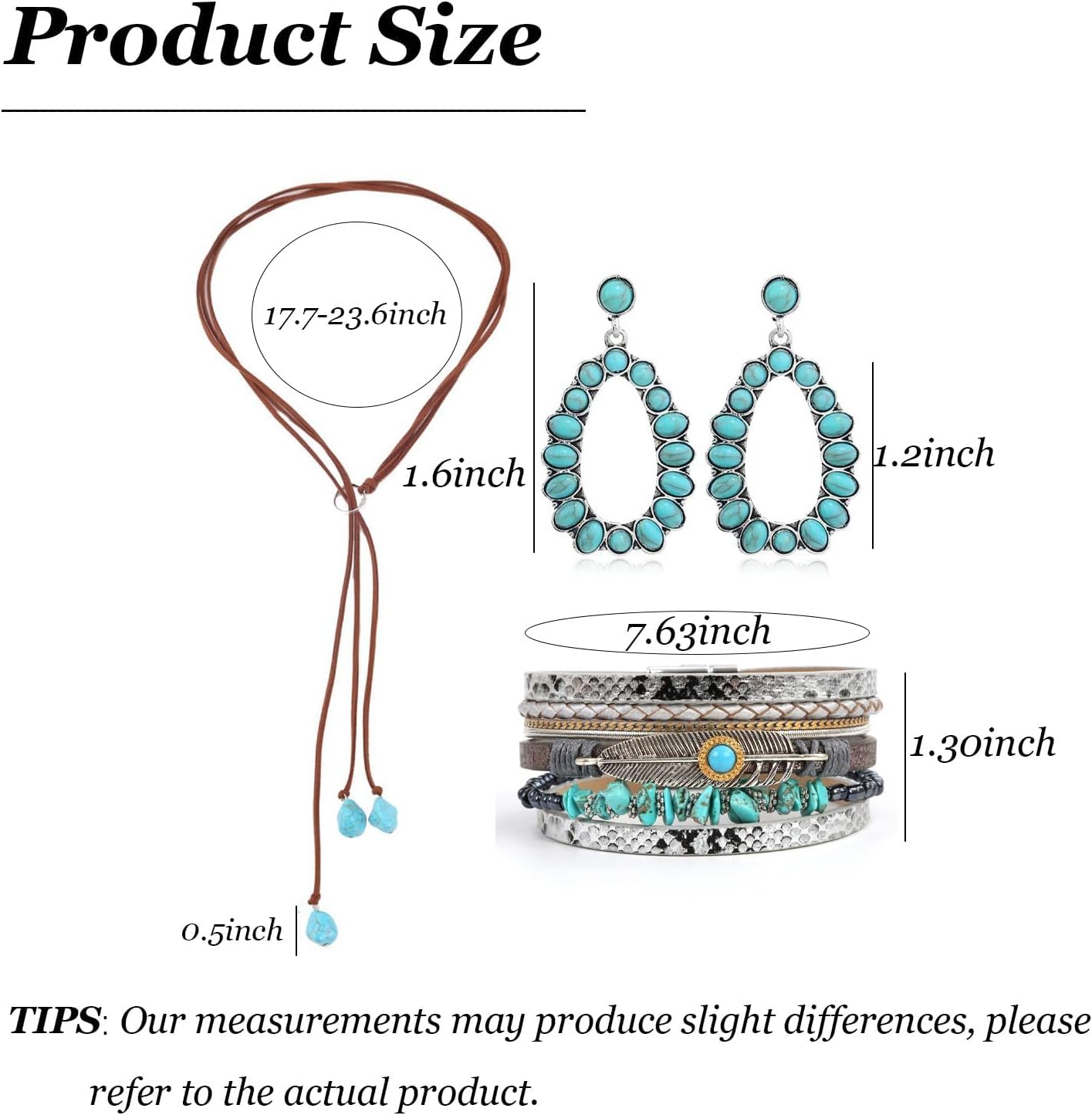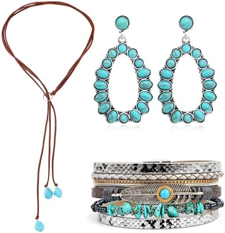 Turquoise Jewelry for Women Western Necklace Earrings Bracelet for Women Bohemian Turquoise Stone Cowgirl Jewelry Set Handmade Adjustable Choker with Leather Cord Birthday Jewelry Gifts Country Concert Cowgirl Outfits Boho Dresses for Women