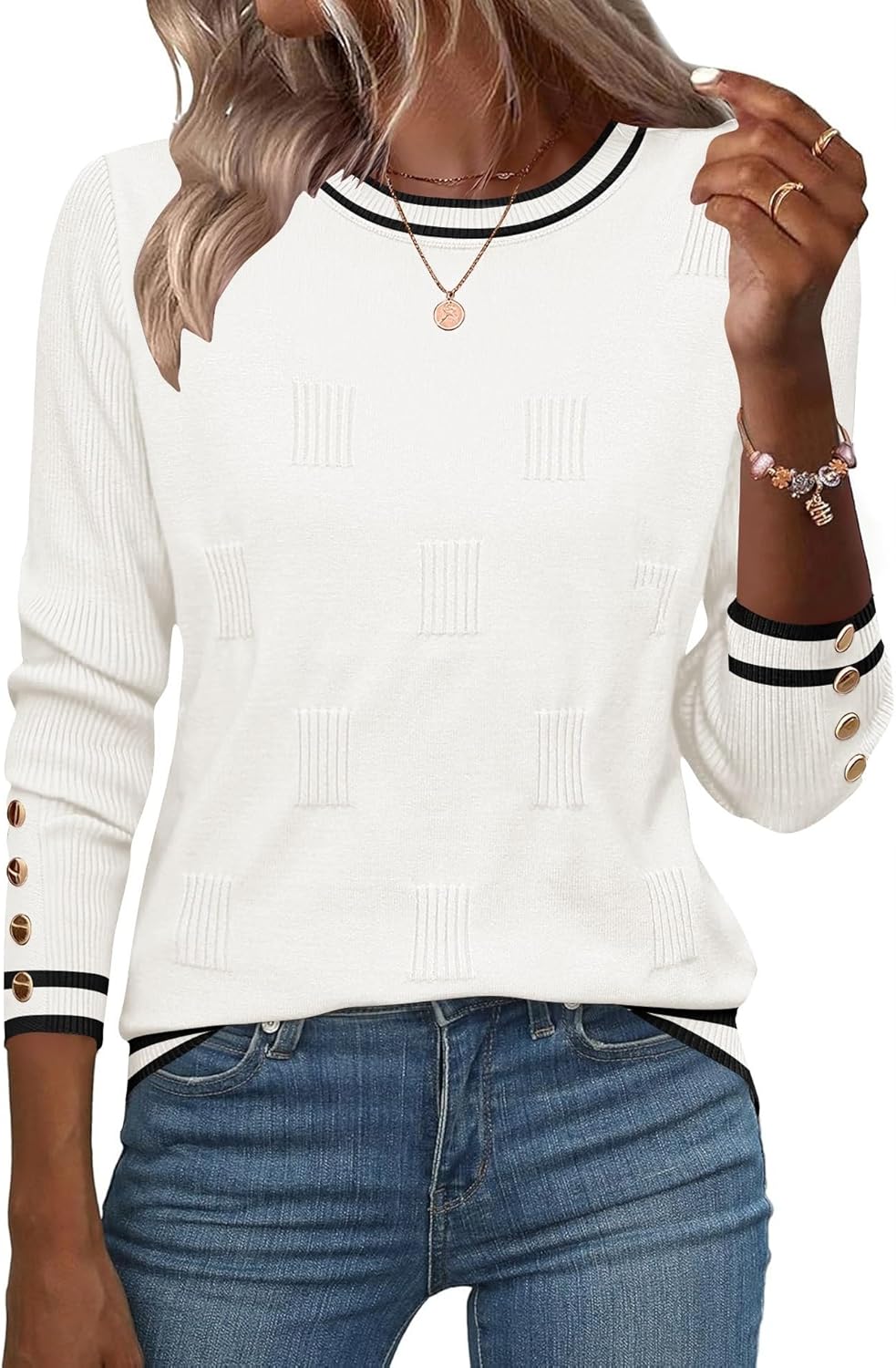 AKEWEI Womens Sweaters Long Sleeve Crew Neck Lightweight Knit Pullover Tops with Decorative Buttons