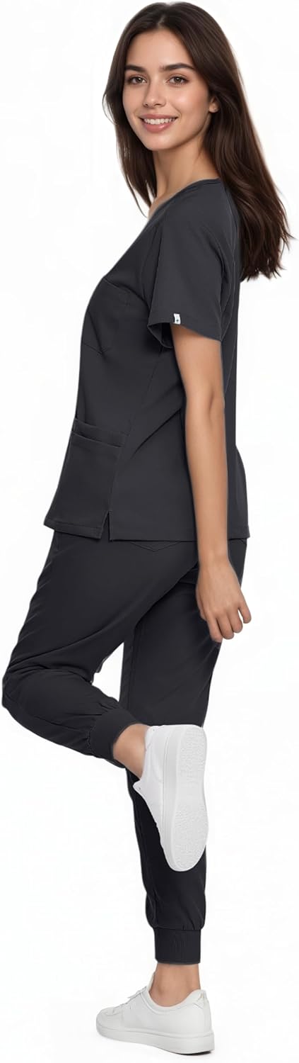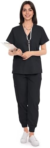SUNME Scrubs for Women Set, V-Neck Scrub Top & Jogger Pants Medical Uniform with 9 Pockets, Yoga Waistband