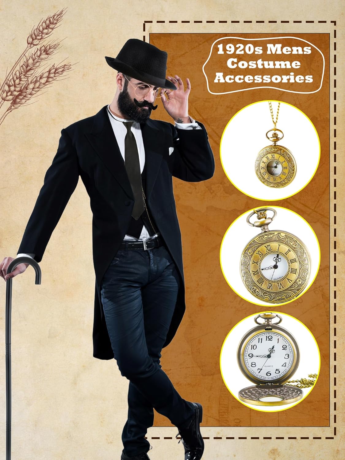 【1920s Men Accessories Wide Application】: Monopoly costume accessories for men, perfect for 1920s parties, proms, Gatsby parties, theme parties, cocktail parties, weddings, vintage style occasions, and great costume set for everyday wear to match your outfit for holidays or other special occasions. A great gift for your husband, father or boyfriend 【1920s Men Accessories Specification】: Material: Men costume accessories: Polyester Magnifying glass: Zinc alloy Round head scepter and glasses: Plastic Color: As shown in the pictures Quantity: 12 pieces 【Package include】: 1 x adult top hat 1 x bow tie 1 x tie 1 x scepter 1 x elastic suspenders 1 x pocket watch 1 x magnifying glass 1 pair of gloves 1 pair of glasses 1 set of 12 beards 1 set of clips ( 2 pcs ) 1 pair of men's armbands