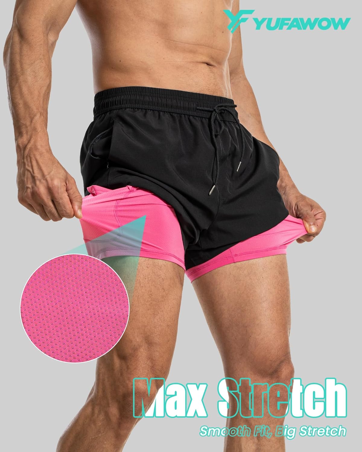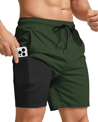 Men Swim Trunks with Compression 7 Inches Breathable Liner Quick Dry Zipper Pockets for Board Beach Gym Running