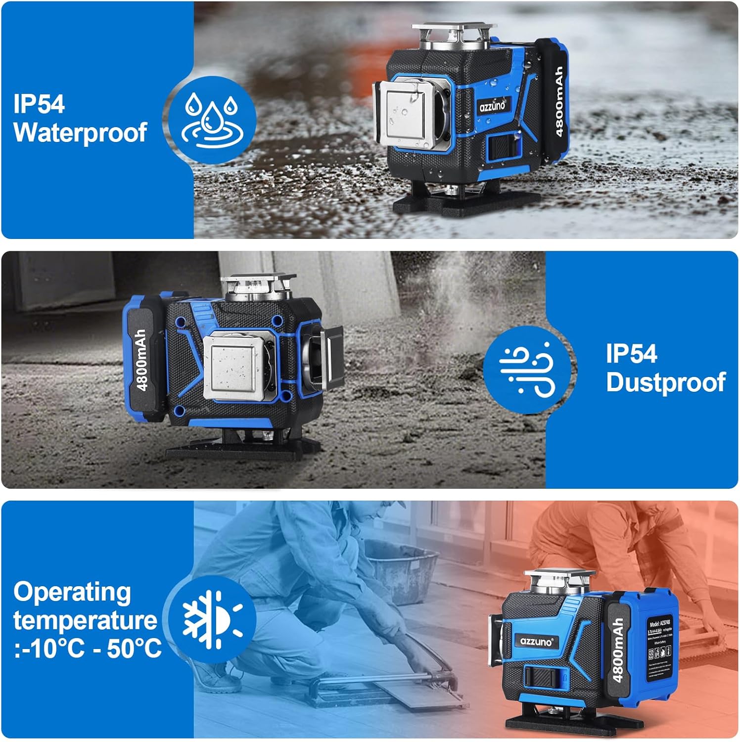Laser Level with Tripod, AZZUNO 4x360 Laser Level 360 Self Leveling for Picture Hanging, Rotating Laser Covers Green Line Laser with 2x4800mAh Li-ion Battery, Ideal for Outdoor, Construction, Tile