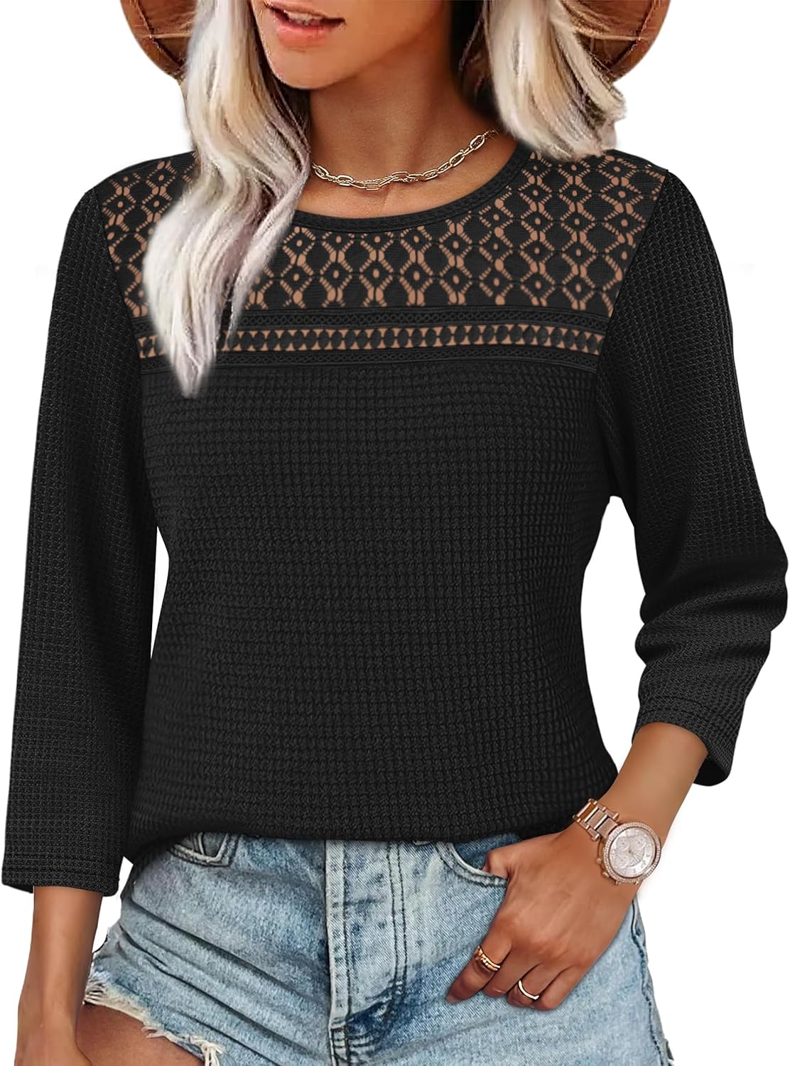 OFEEFAN 3/4 Length Sleeve Womens Tops Early Fall Fashion 2025 Dressy Casual Blouses Lace Front Trendy Waffle Knit Shirts