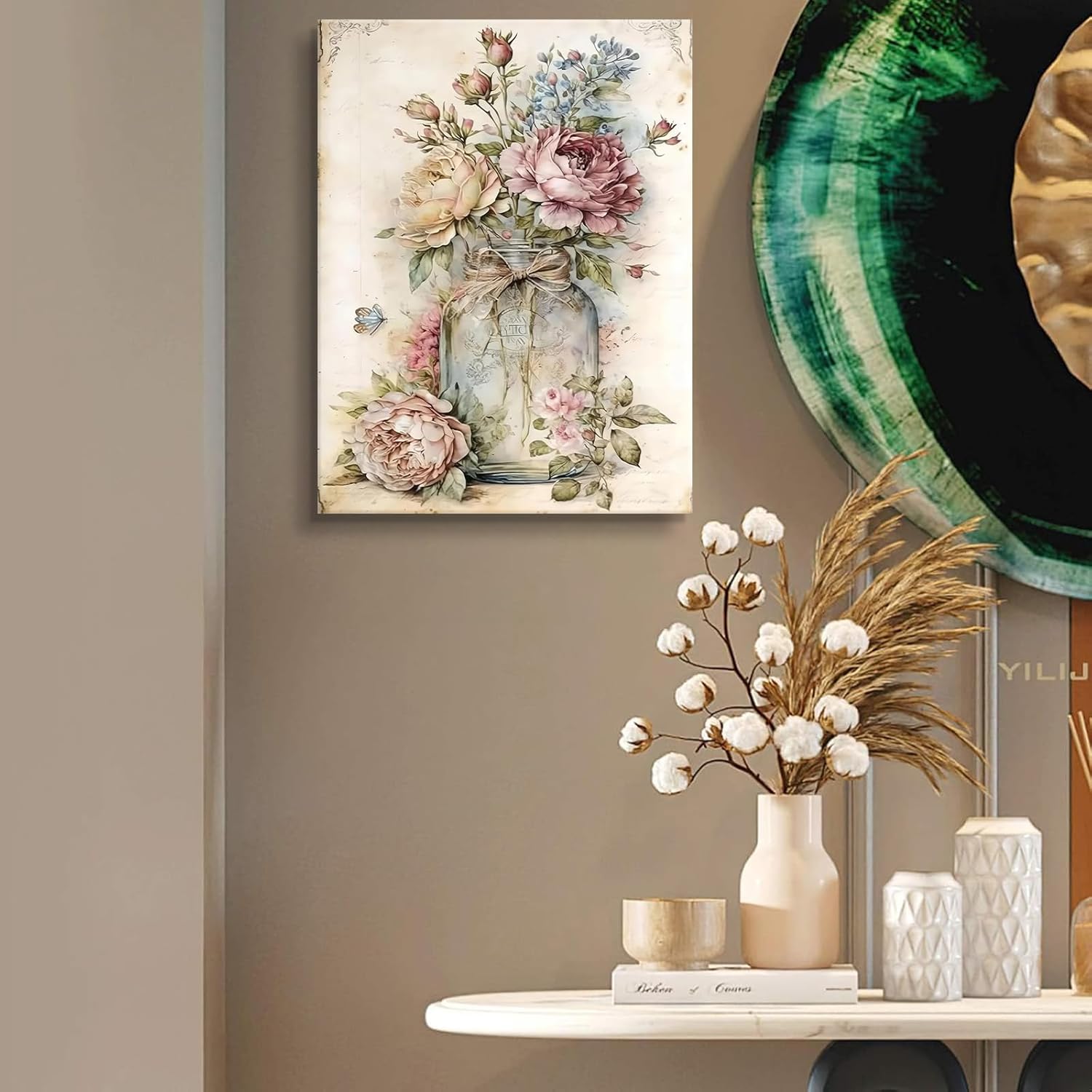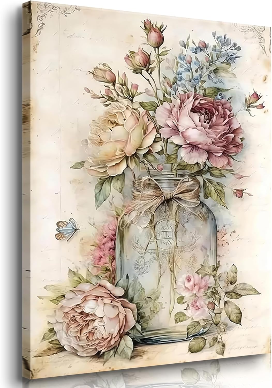 Vintage Rose Wall Art Pink Wildflowers Botanical Wall Decor Mason Jar Floral Canvas Print Victorian Picture Perfect for Bedroom Living Room Bathroom Ready to Hang (12x16in Canvas)