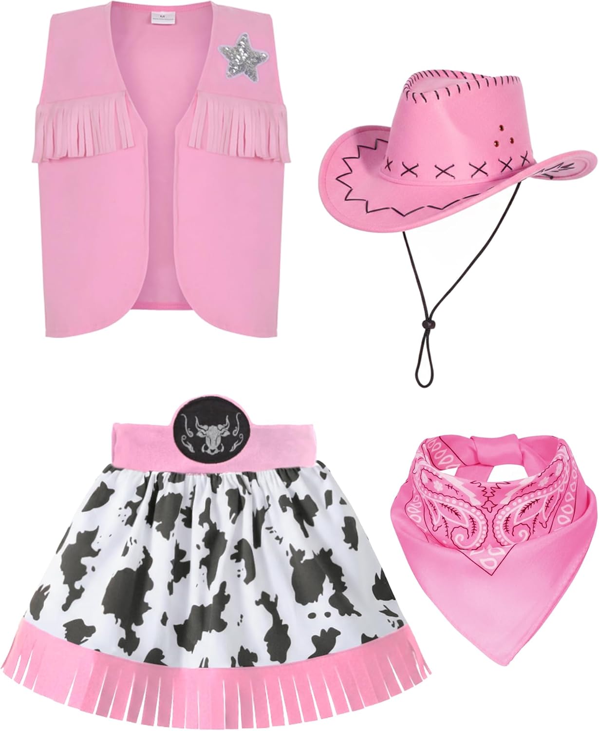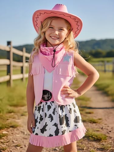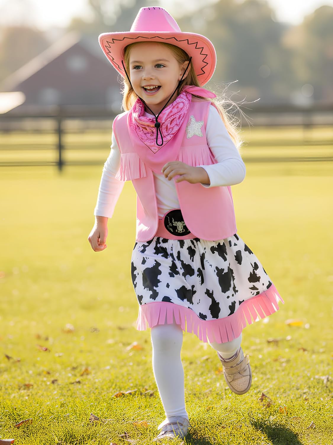 Giddy up for adventure with this utterly charming Pink Cowgirl Costume Set! This complete 4-piece ensemble features a delightful pink western vest with silver star details and fringe, matching pink cowboy hat, adorable cow print skirt with pink fringe trim, and coordinating patterned bandana. This complete 4-piec expertly blending traditional cowboy elements with a playful pink color scheme and cute dairy cow patterns, this outfit offers a unique twist on classic western wear. Perfect for dress-up, theme parties, Halloween or imaginative play, this high-quality costume set will transform your little one into the cutest cowgirl on the ranch. Watch her confidence and creativity grow as she embarks on wild western adventures in this adorable and photogenic outfit!