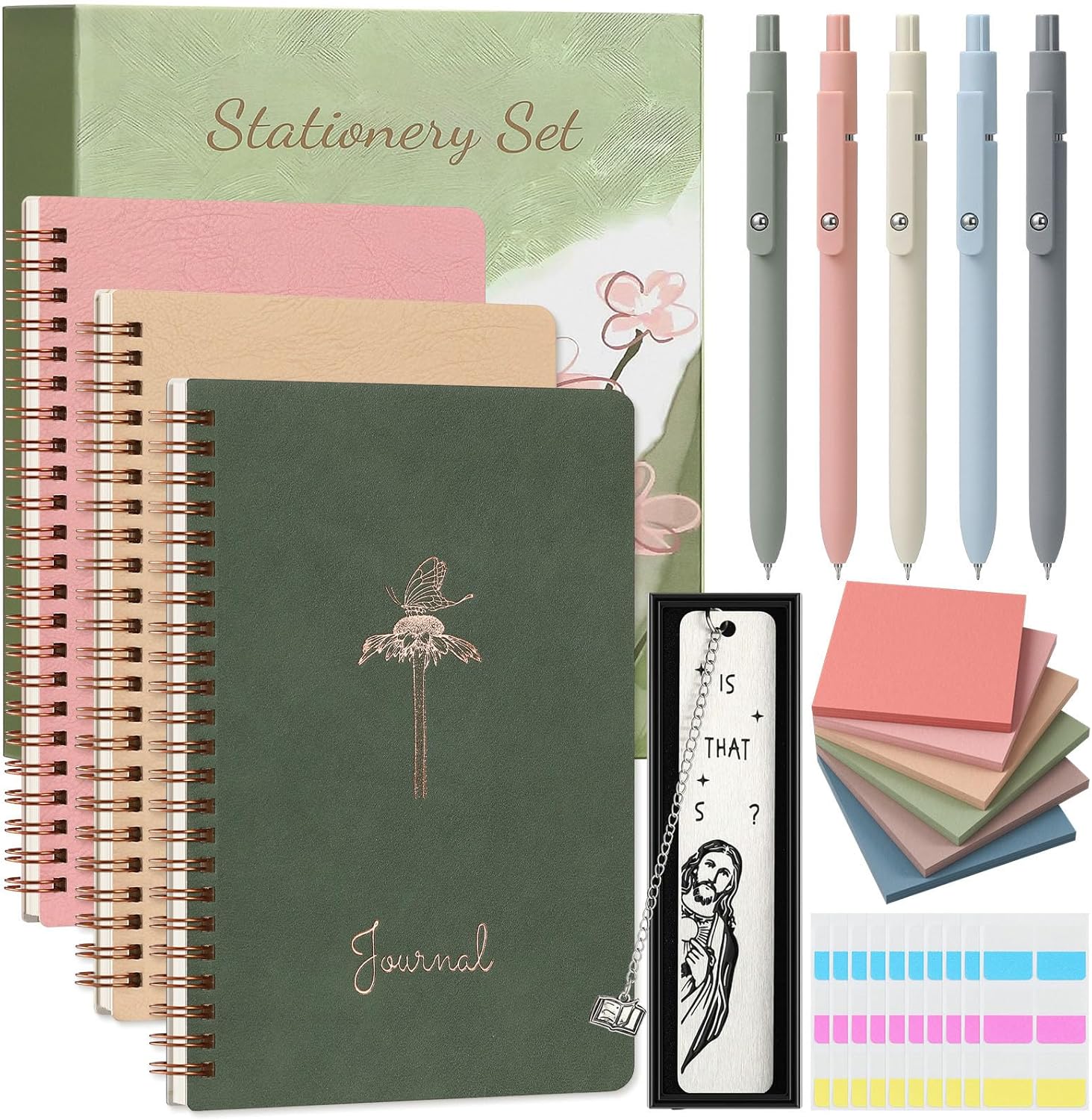 Stationery Set for Women, Journaling Kit, 3PCS A5 Spiral Notebooks, Gel Pens, Steel Bookmark, Sticky Notes & Tabs, Gift Box - Aesthetic Gift Set for Work Students School Office Supplies