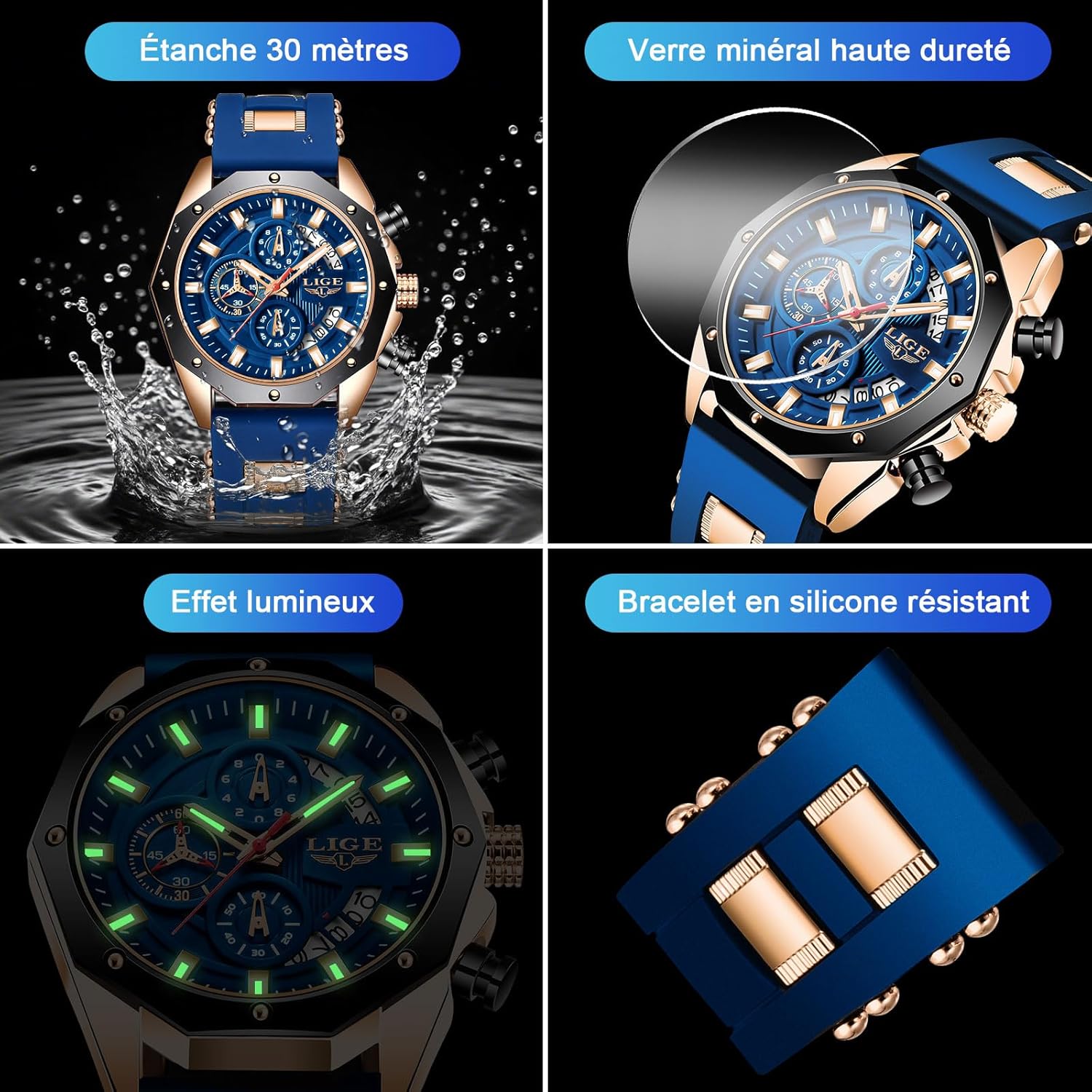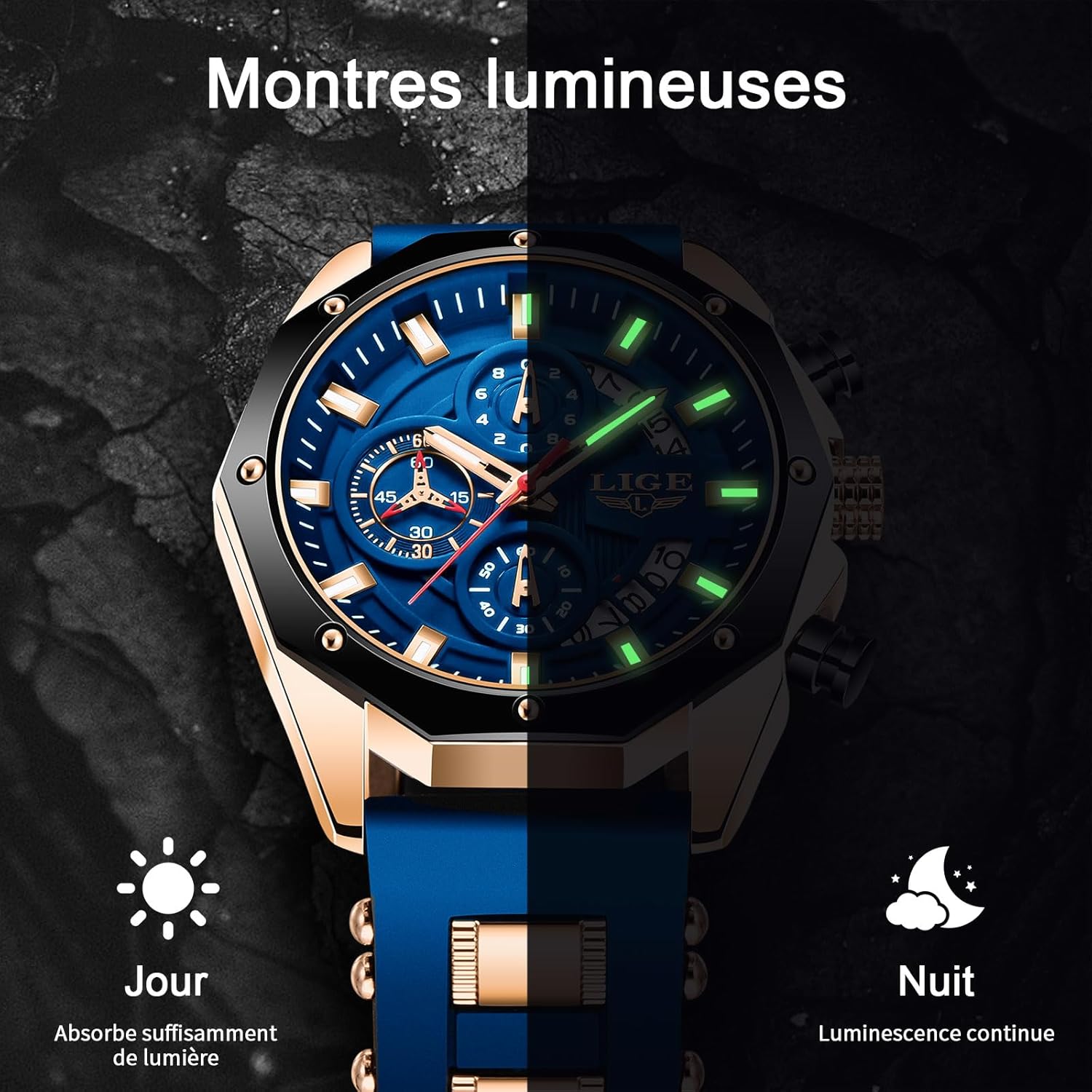 LIGE Men's Wrist Watches Analog Dress Waterproof Work Casual Unique Vintage Chronograph Quartz 3ATM Water Resistant Silicone Strap Luminous Date Elegance Daily Chronograph Watch