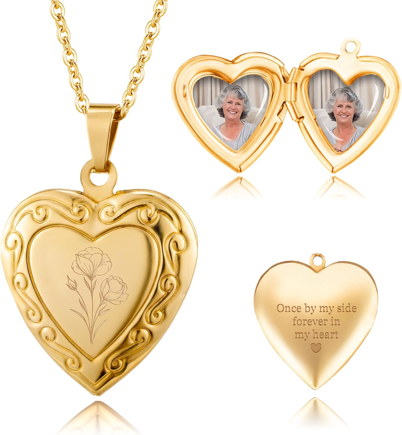 Easycosy Custom Photo Locket Necklace for Women, Stainless Steel Heart Pendant Holds Pictures, 20 Inch Chain, Personalized Photo Necklace Gift for Girlfriend, Wife, Mom, Grandma (Style4-Flower&Photo)