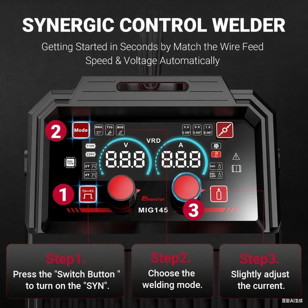 【Synergic MIG/MAG Welder】: Utilizing a MIG unitary design, it operates seamlessly under various power conditions.When you change the wire diameter (note: solid wire only welds at 0.8mm) or adjust the current, the machine automatically alters the voltage and wire feed speed for optimal results. And manual adjustments are also supported, allowing welders to fine-tune parameters based on personal preferences. This makes the operation straightforward,enabling both beginners and professional welders to get started quickly.