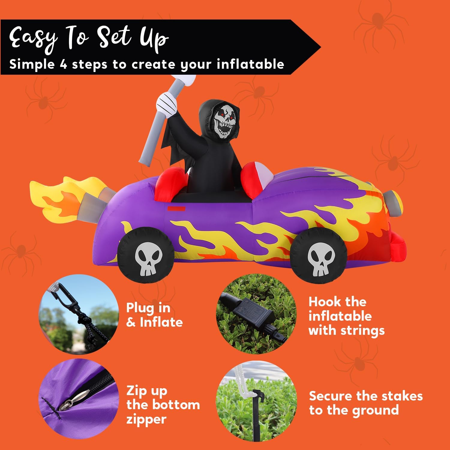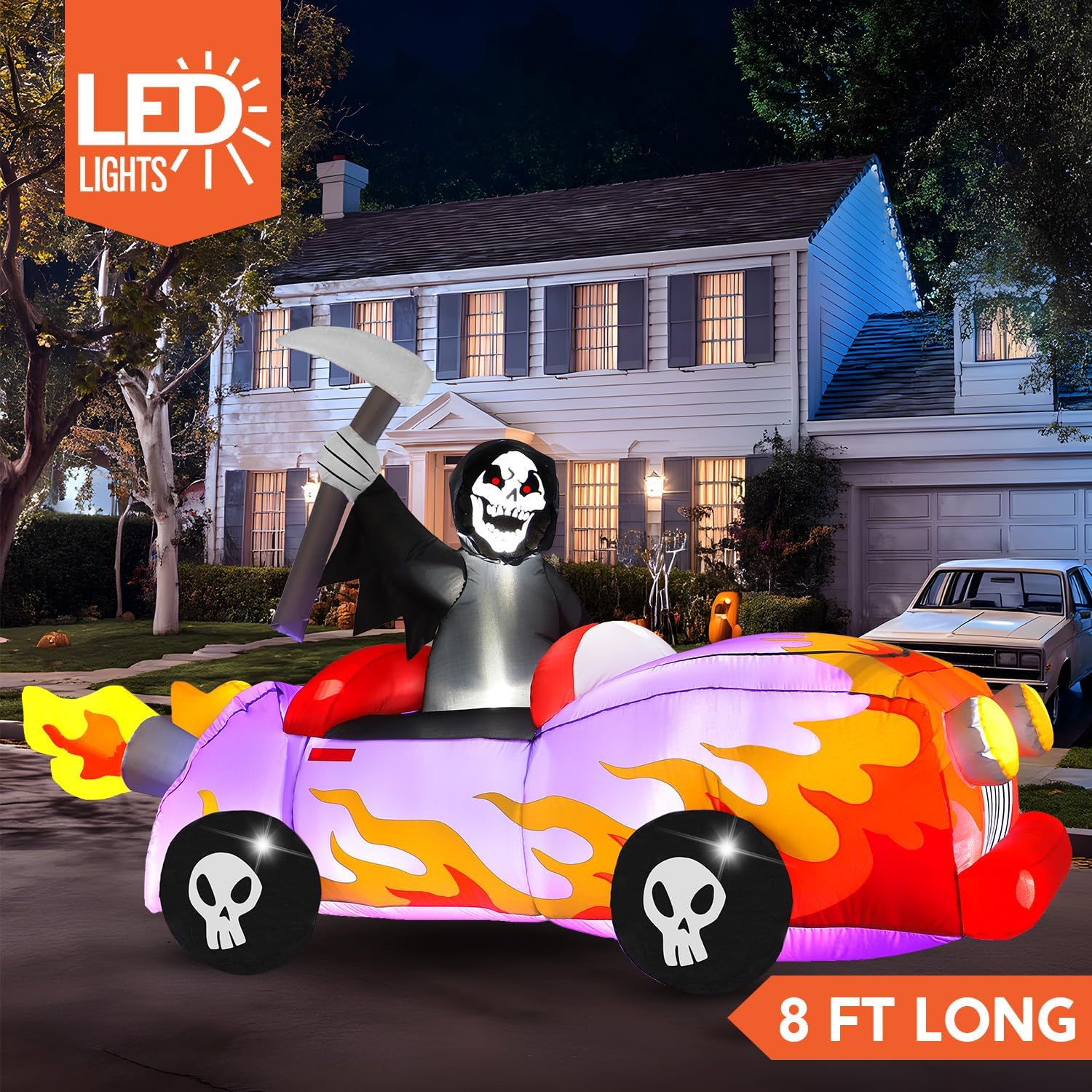 Joiedomi 8ft Long Halloween Inflatable Grim Reaper Driving Car, Halloween Inflatable Outdoor Decoration with Build-in LEDs, Blow Up Yard Decorations for Garden Party Holiday Lawn Decor