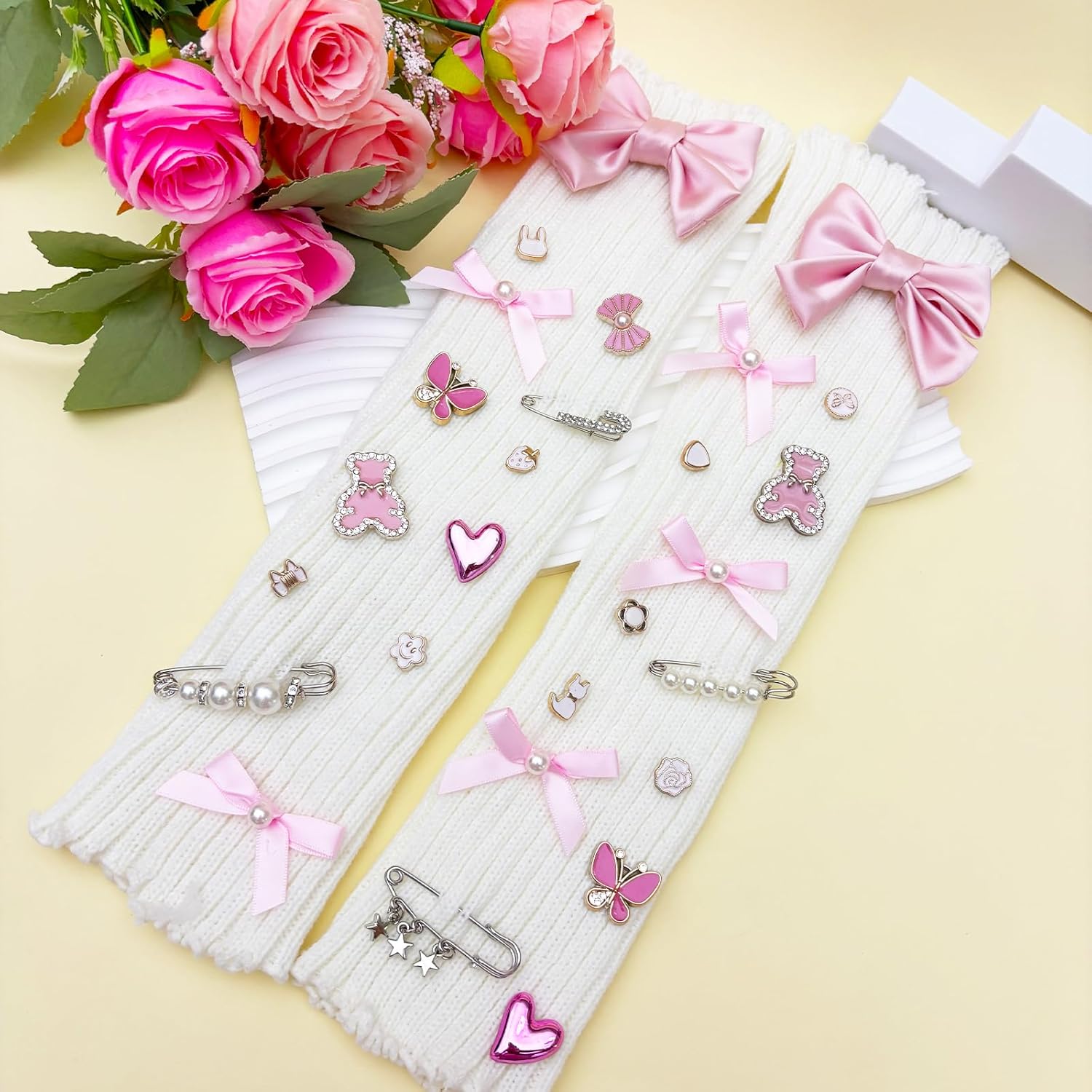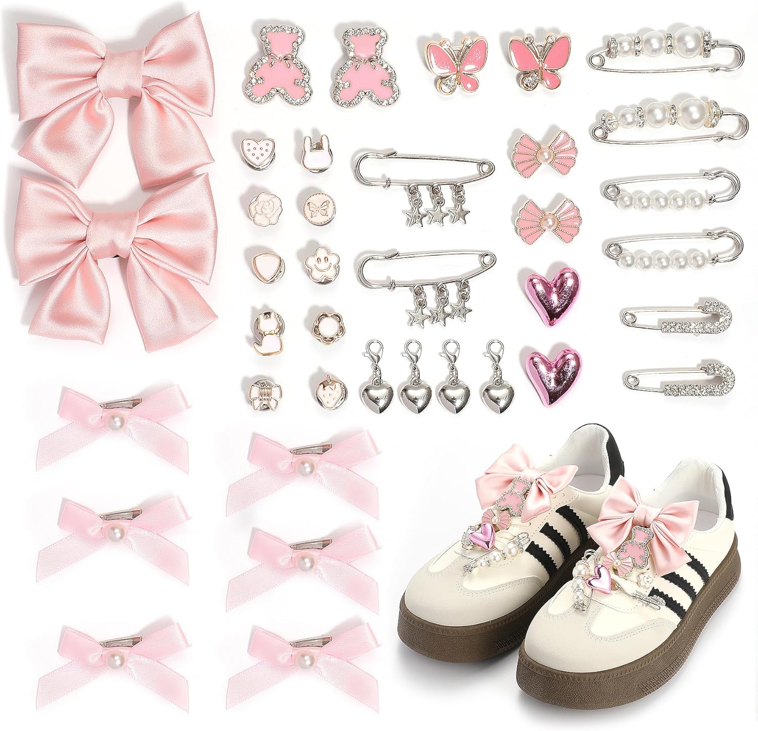 38Pcs White Bow Shoe Charms for Sneakers Girls, Shoe Lace Charms Clips, Bling Shoelace Junk Socks Charms Kit for Women, Jewelry Making Kits