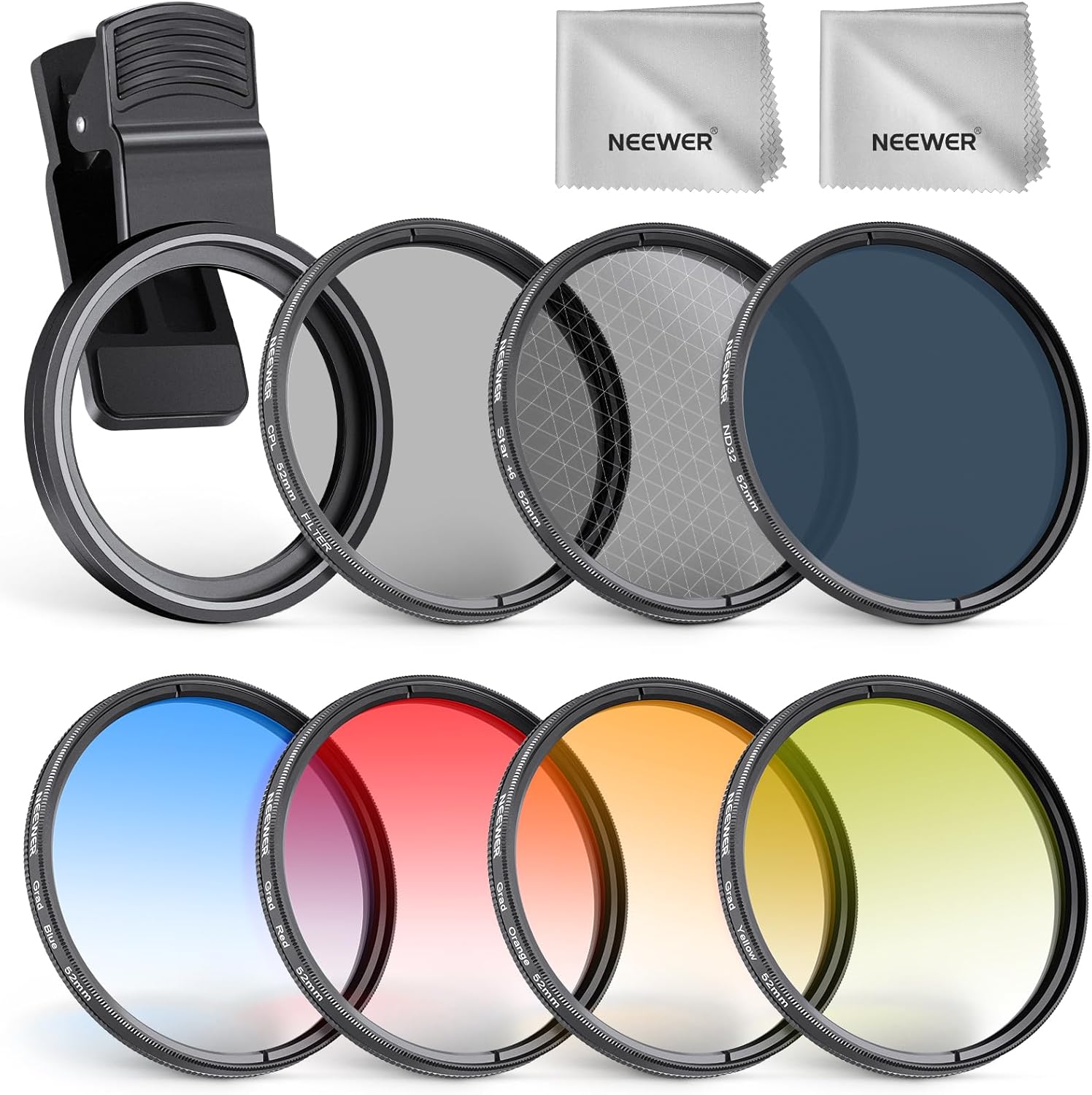 【Versatile Phone Filter Kit】 NEEWER 52mm clip on filter 7 pack kit elevates your mobile photography gear to DSLR digital camera levels as content creator essential and influencer must have. Ideal for travel, street, landscape, and time lapse photography, as well as weddings and social media. Includes a compact and portable carrying case for easy storage and transport, perfect for cell phone accessories on the go