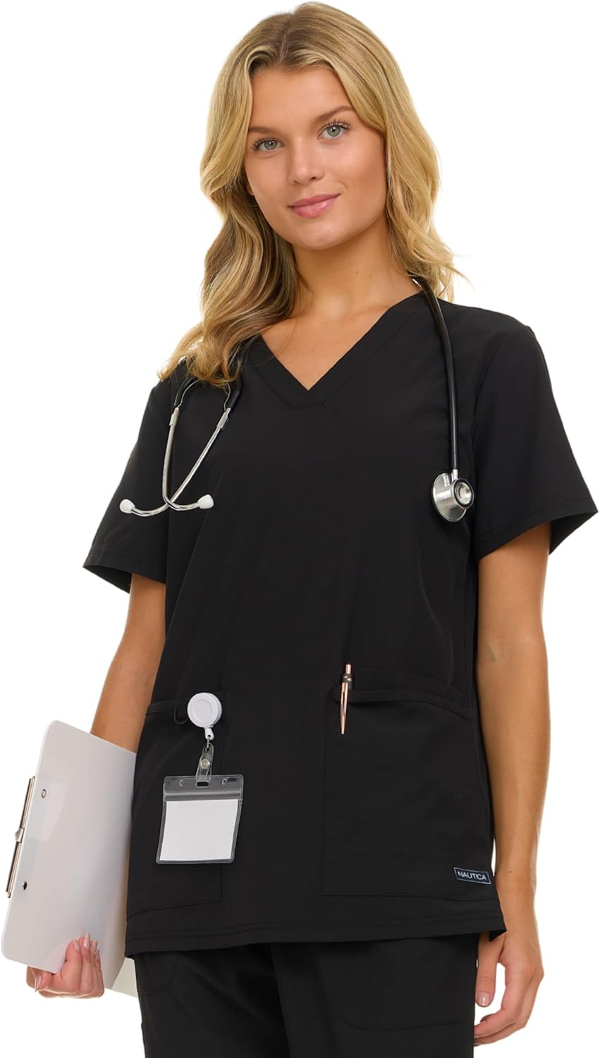 Nautica Womens Scrubs Tops, V-Neck Breathable Scrub Tops Women, 3 Pocket Stretch Fabric Scrubs for Women, Medical Scrub Shirt