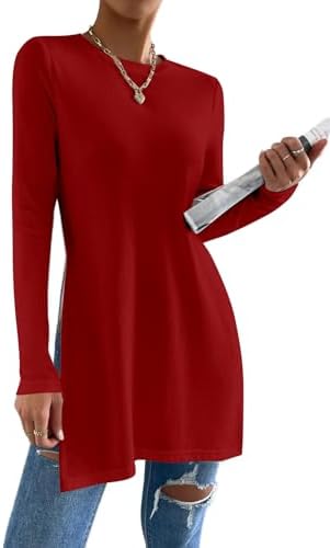 Remidoo Side Slit Tees for Women Long Sleeve T Shirt Crewneck Solid Casual Split Hem Tops