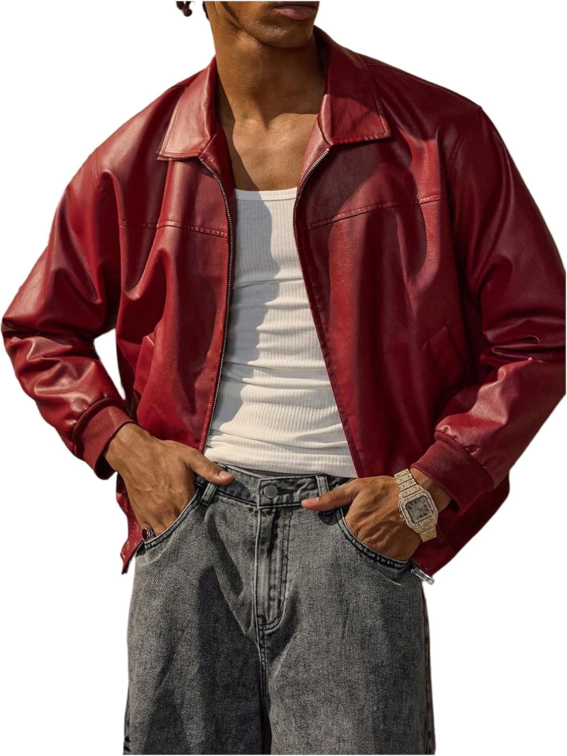 Verdusa Men's Vintage Leather Jacket Zip Up Long Sleeve Collared Outwear with Pockets