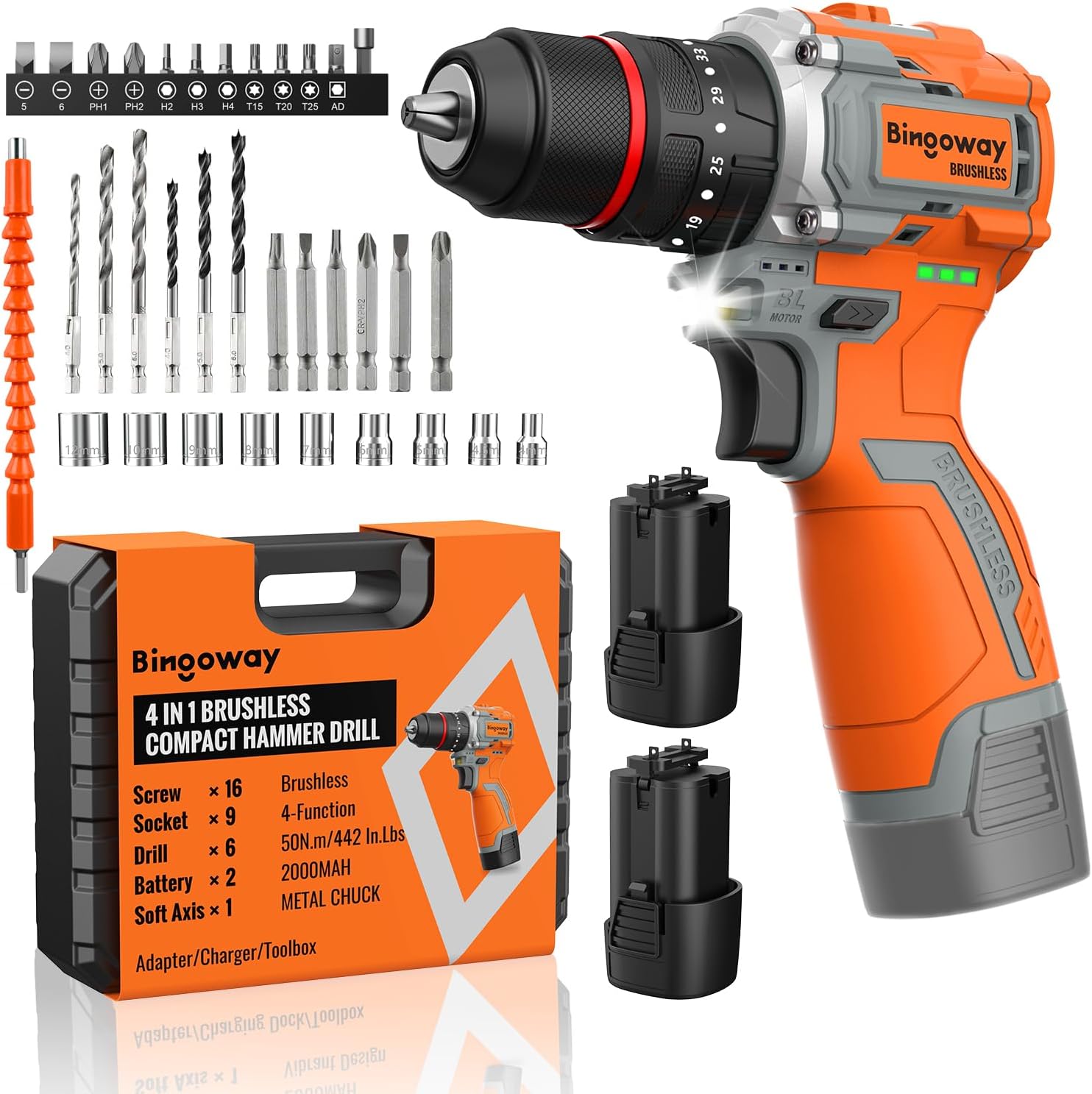 【Upgraded Brushless Powerhouse】50N.m massive torque from our advanced brushless motor. 200% more power and 35% longer lifespan than brushed drills, and maintains peak power under load. Tackle heavy-duty housework effortlessly!