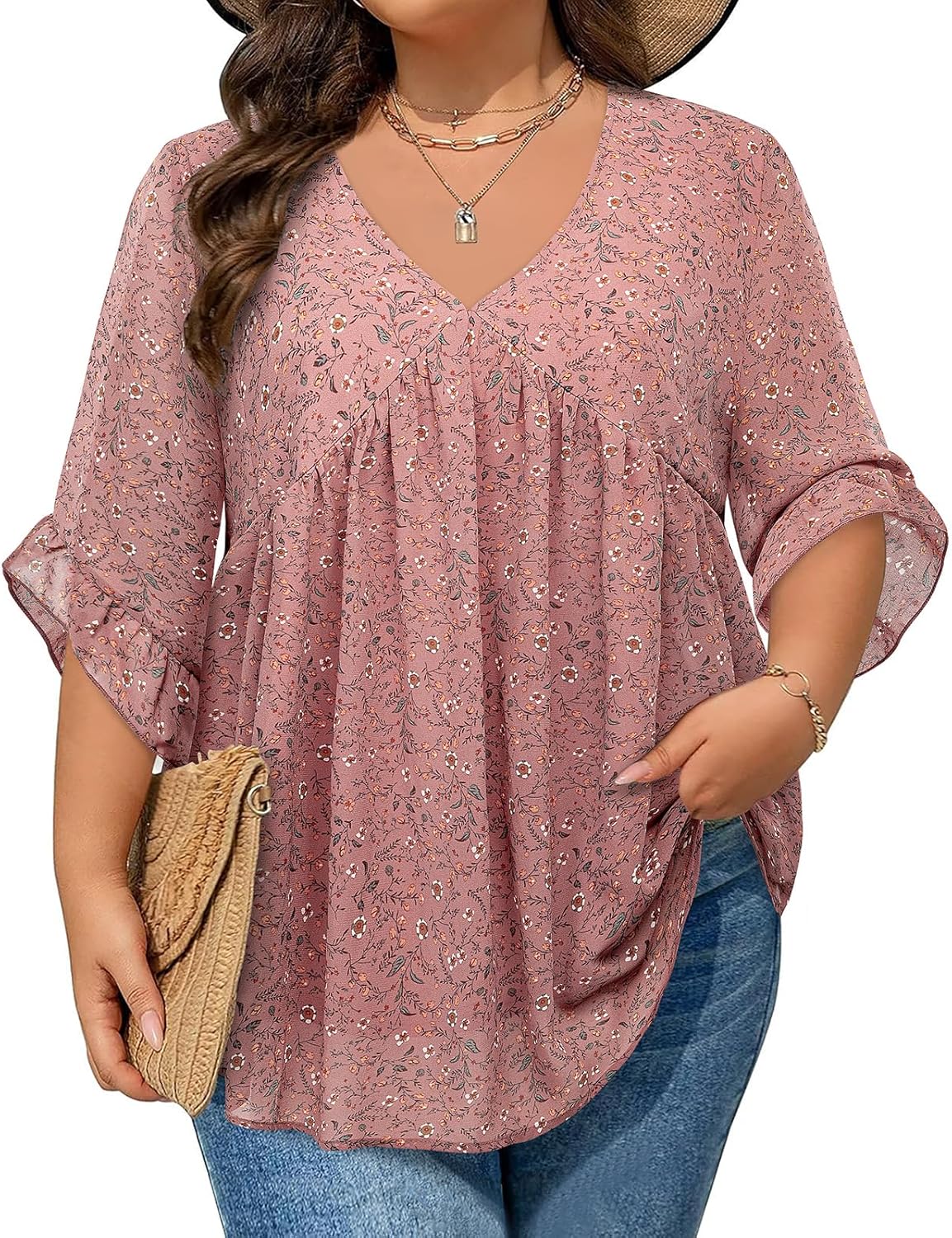 Siddhe Womens Plus Size Tops 3/4 Ruffle Sleeve Blouses V Neck Chiffon Shirts Babydoll Dressy Casual Tunic Top XL-5XL