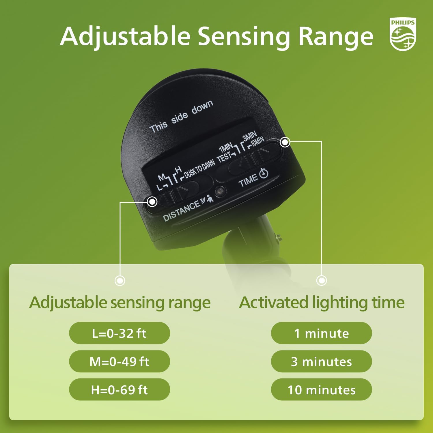 HIGH-SENSITIVITY MOTION SENSOR - High-sensitivity passive infrared (PIR) motion sensor detects motion up to 69 ft away over a 180° angle; you can set light on time for 1, 3, or 10 mins.
