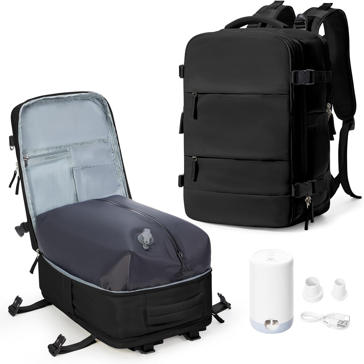Vacuum Backpack Travel with Pump for Women Men Large Carry on Backpack Flight Approved Personal item Travel Bag with Vacuum System Black