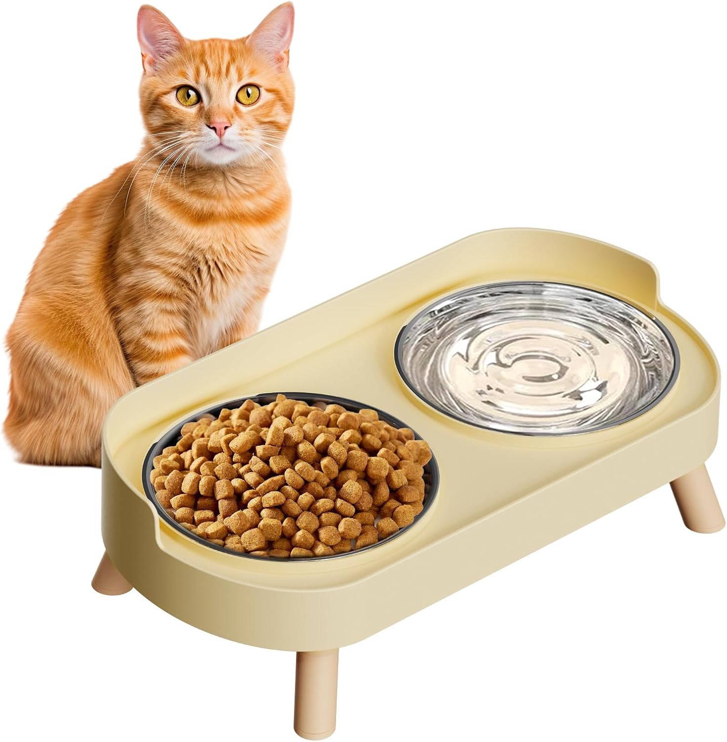 Elevated Cat Bowl, Raised Cat Food and Water Bowl Set for Indoor Cats, Splash Proof with 2 Stainless Steel Pet Food Bowls for Cats and Puppies, Whisker Fatigue and Dishwasher Safe - Yellow
