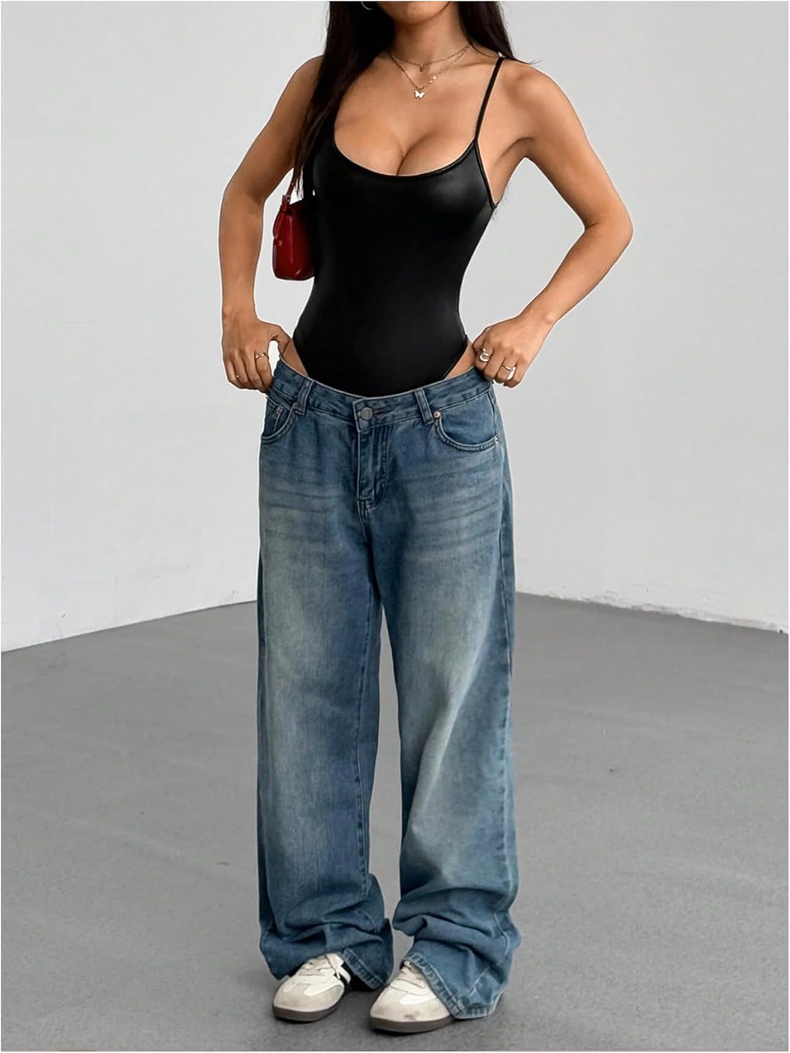 Milumia Women's PU Leather Spaghetti Strap Bodysuit Scoop Neck Backless Cami Tops