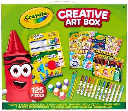 125-PIECE CRAYOLA ART KIT: Includes 96 Crayons, 6 Washable Paints, 4 Brushes, 12 Ultra-Clean Markers, 4 Tubs of Model Magic, 2 Giant Coloring Books, and more – all in one reusable storage box.
