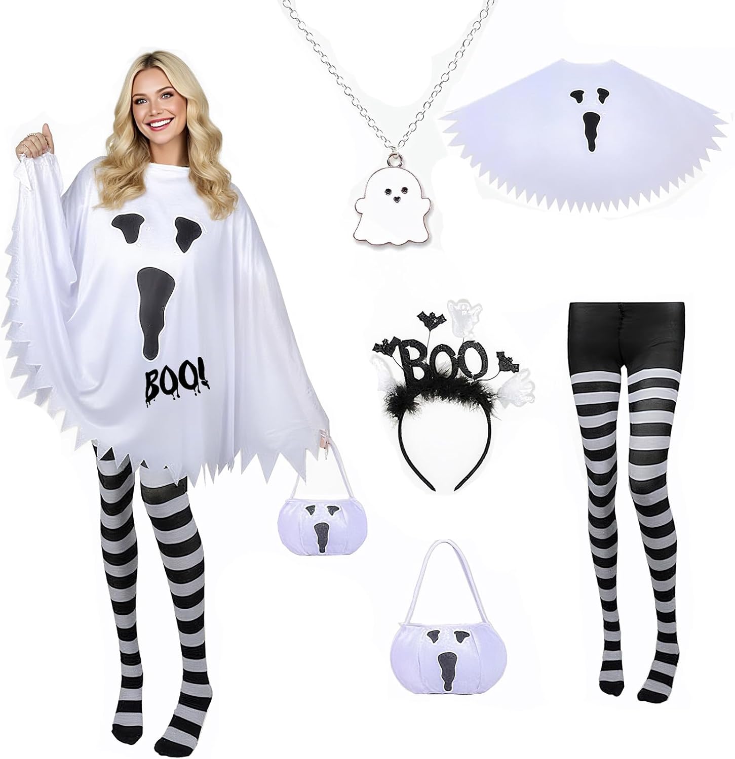 5 PCS Halloween Costume Set for Women Adult Ghost Costume, Poncho, Candy bag, Ghost Headband and Nylon Striped Tights for Halloween Cosplay Party