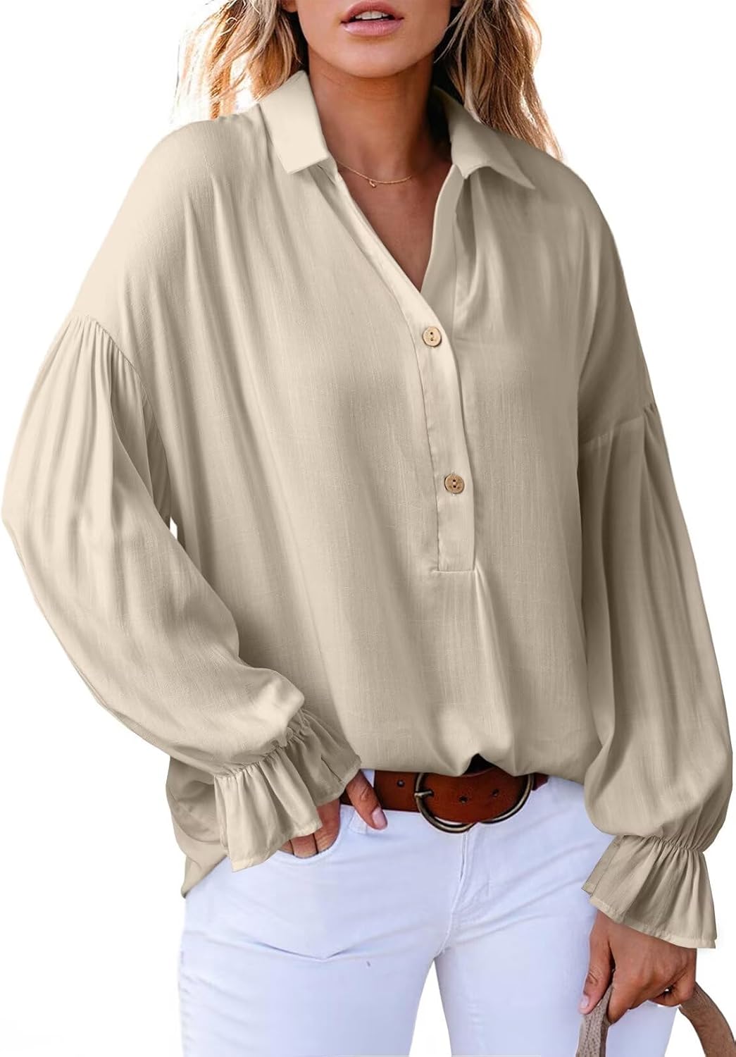 Astylish Women's Casual Blouses Business Linen Tops Cute Puff Sleeve V Neck Button-Down Henley Shirts 2025 Fall Outfits