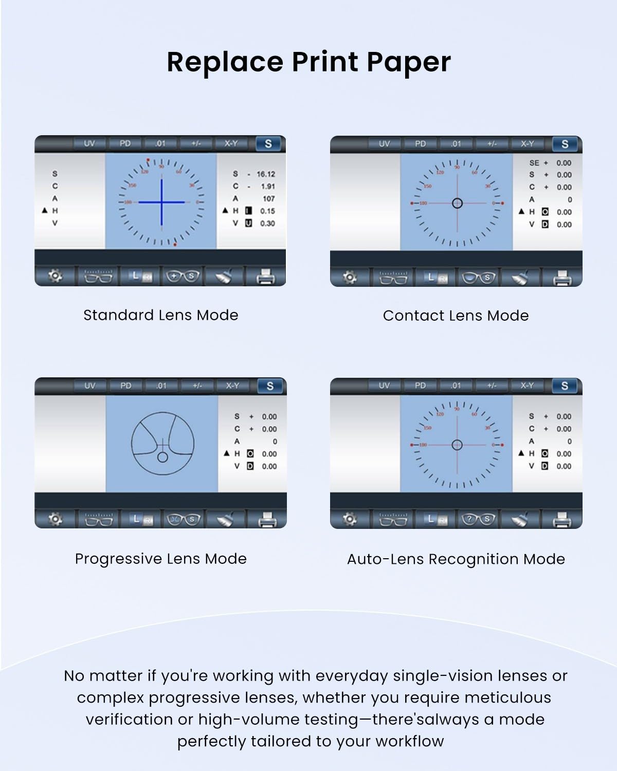 【Green LED, no need for Abbe's coefficient compensation】: Our Lensmeter utilizes a green LED light source, which eliminates the need for Abbe's coefficient compensation and ensures faster, distortion-free measurements. The built-in ambient light calibration function updates every 5-30 minutes to ensure consistent UV accuracy.