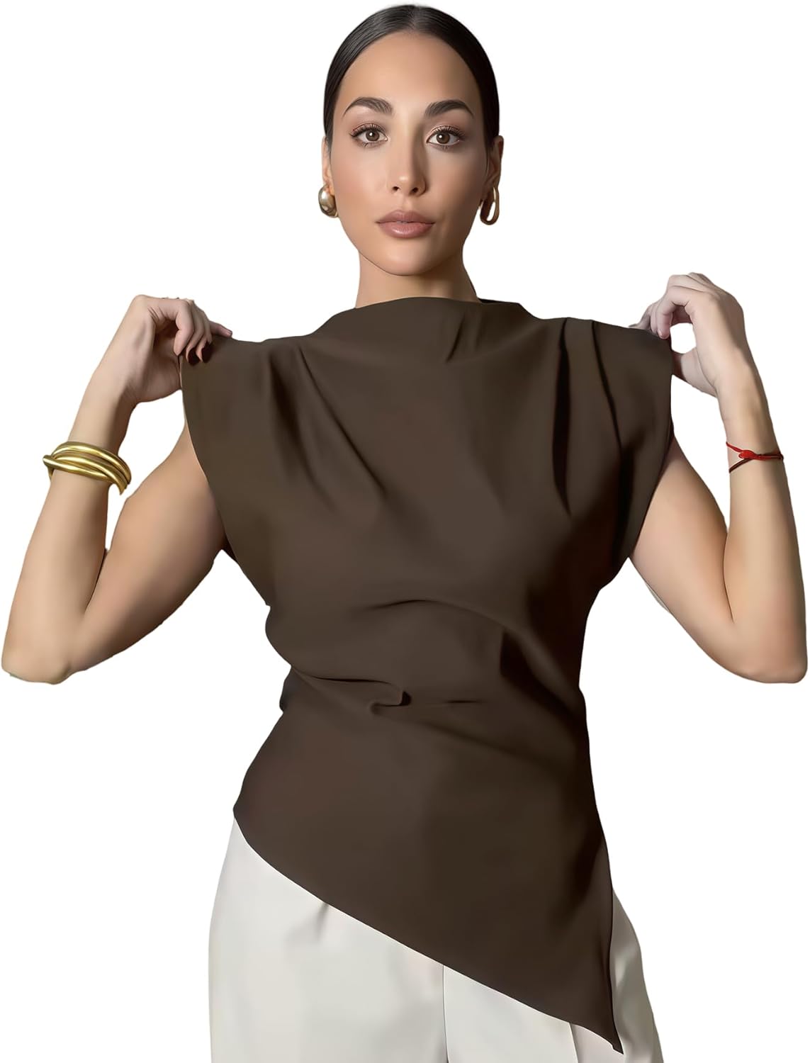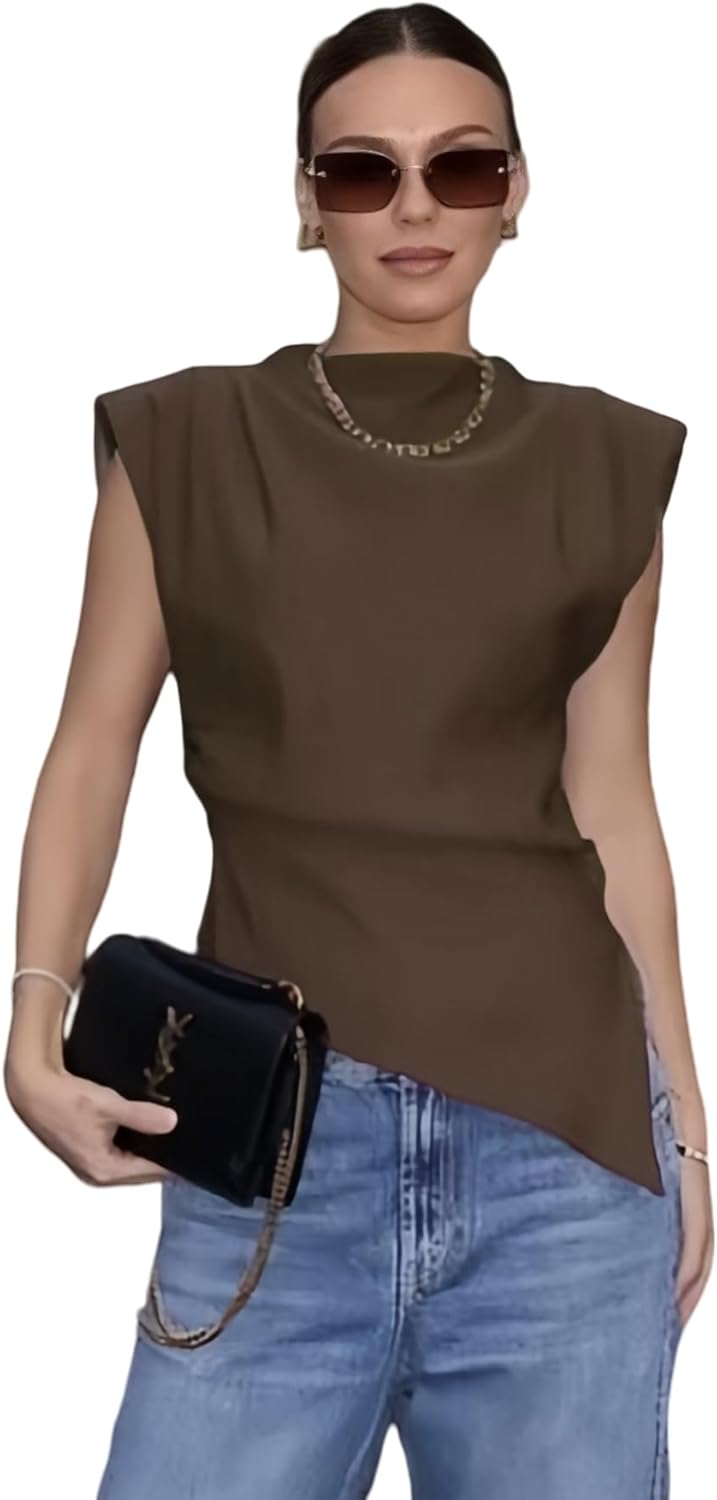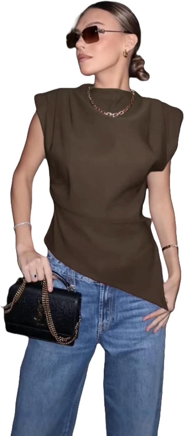 Suillty Women's Ruched Cap Sleeve Shoulder Pad Tank Tops Asymmetrical Hem Zipper Summer Casual Basic Tee Shirt Blouses