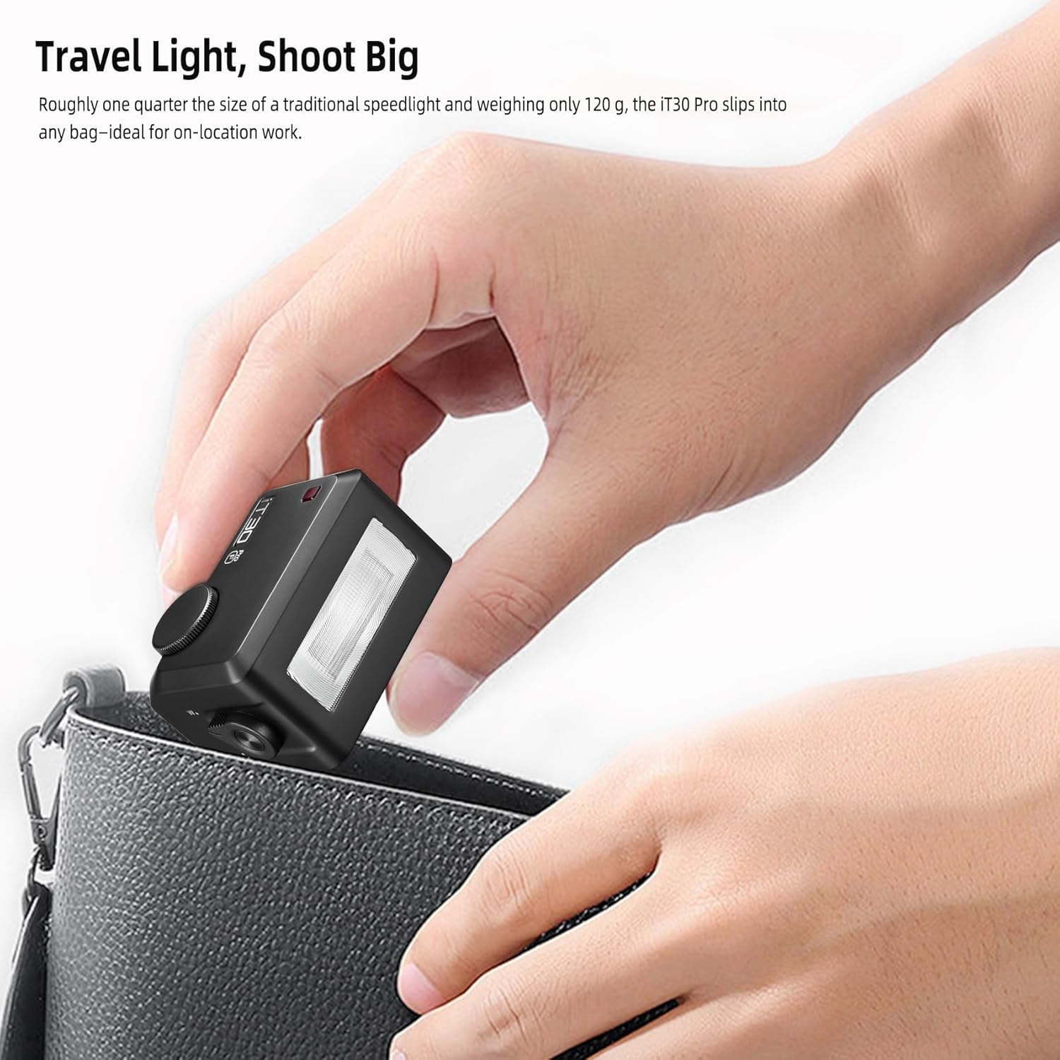 [120g Ultra-Compact Design: Pocket-Sized Powerhouse]: Weighing just 120g (¼ the size of traditional speedlites), this mini flash fits in pockets, camera bags, or gear pouches—ideal for travel, street photography, or on-location shoots where portability is key. Compact yet powerful, it keeps your setup lightweight without sacrificing features.